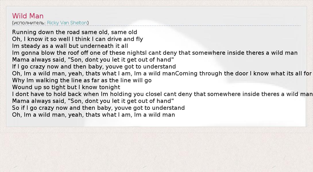 Running down the road same old, same old Oh, I know it so well I think I can drive and fly Im steady as a wall but underneath it all Im gonna blow the roof off one of these nightsI cant deny that somewhere inside theres a wild man Mama always said, "Son, dont you let it get out of hand" If I go crazy now and then baby, youve got to understand Oh, Im a wild man, yeah, thats what I am, Im a wild manComing through the door I know what its all for Why Im walking the line as far as the line will go Wound up so tight but I know tonight I dont have to hold back when Im holding you closeI cant deny that somewhere inside theres a wild man Mama always said, "Son, dont you let it get out of hand" So if I go crazy now and then baby, youve got to understand Oh, Im a wild man, yeah, thats what I am, Im a wild man