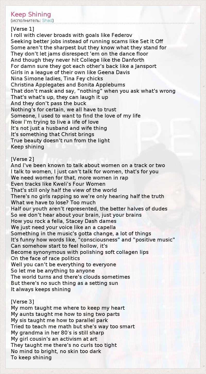 [Verse 1] I roll with clever broads with goals like Federov Seeking better jobs instead of running scams like Set It Off Some aren't the sharpest but they know what they stand for They don't let jams disrespect 'em on the dance floor And though they never hit College like the Danforth For damn sure they got each other's back like a Jansport Girls in a league of their own like Geena Davis Nina Simone ladies, Tina Fey chicks Christina Applegates and Bonita Applebums That don't mask and say, "nothing" when you ask what's wrong That's what's up, they can laugh it up And they don't pass the buck Nothing's for certain, we all have to trust Someone, I used to want to find the love of my life Now I'm trying to live a life of love It's not just a husband and wife thing It's something that Christ brings True beauty doesn't run from the light Keep shining [Verse 2] And I've been known to talk about women on a track or two I talk to women, I just can't talk for women, that's for you We need women for that, more women in rap Even tracks like Kweli's Four Women That's still only half the view of the world There's no girls rapping so we're only hearing half the truth What we have to lose? Too much Half our youth aren't represented, the better halves of dudes So we don't hear about your brain, just your brains How you rock a fella, Stacey Dash dames We just need your voice like an a capella Something in the music's gotta change, a lot of things It's funny how words like, "consciousness" and "positive music" Can somehow start to feel hollow, it's Become synonymous with polishing soft collagen lips On the face of race politics Well you can't be everything to everyone So let me be anything to anyone The world turns and there's clouds sometimes But there's no such thing as a setting sun It always keeps shining [Verse 3] My mom taught me where to keep my heart My aunts taught me how to sing two parts My sis taught me how to parallel park Tried to teach me math but she's way too smart My grandma in her 80′s is still sharp My girl cousin's an activism at art They taught me there's no curls too tight No mind to bright, no skin too dark To keep shining