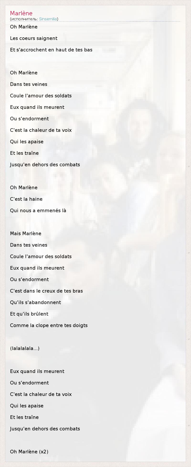 Oh Marlène Les coeurs saignent Et s'accrochent en haut de tes bas Oh Marlène Dans tes veines Coule l'amour des soldats Eux quand ils meurent Ou s'endorment C'est la chaleur de ta voix Qui les apaise Et les traîne Jusqu'en dehors des combats Oh Marlène C'est la haine Qui nous a emmenés là Mais Marlène Dans tes veines Coule l'amour des soldats Eux quand ils meurent Ou s'endorment C'est dans le creux de tes bras Qu'ils s'abandonnent Et qu'ils brûlent Comme la clope entre tes doigts (lalalalala...) Eux quand ils meurent Ou s'endorment C'est la chaleur de ta voix Qui les apaise Et les traîne Jusqu'en dehors des combats Oh Marlène (x2)