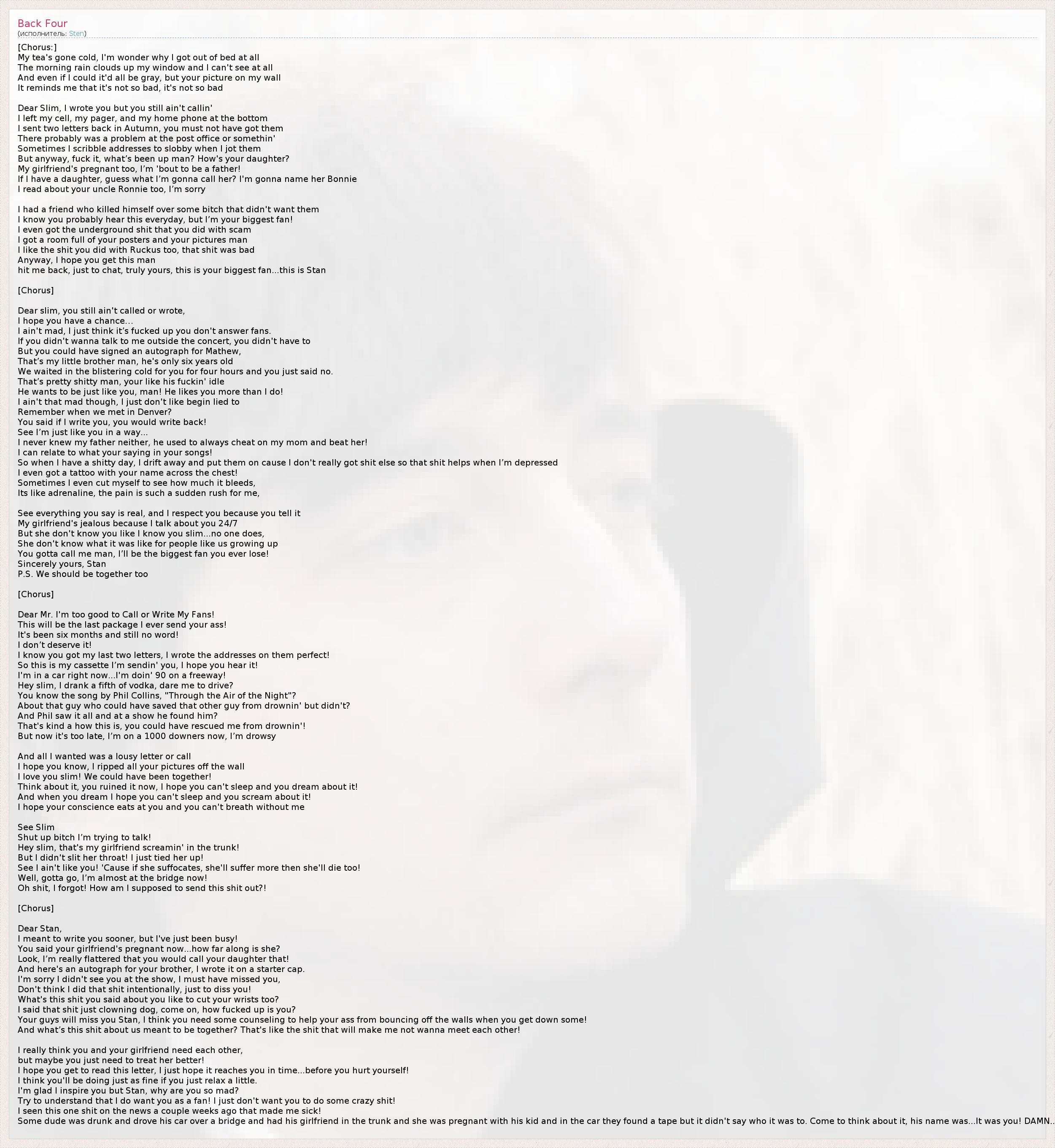 [Припев:] Мой чай остыл. Интересно, как я вообще встала с постели? С утра пасмурно. Перед моим окном непроницаемая стена дождя, И даже если что-то было бы видно, то всё было бы в серой мгле. Но твоё фото на стене Напоминает мне, что всё не так уж и плохо. Дорогой Слим, я писал тебе, но ты никак не звонишь. В конце письма я оставил номер сотового, пейджера и домашний номер. Ещё осенью я отправил два письма, но ты, должно быть, их не получил, Возможно, из-за какой-то проблемы на почте – Иногда, когда тороплюсь, могу написать адрес неразборчиво. Ну, да всё равно, будь с ним не ладно. Как жизнь? Как твоя дочь? Моя подружка тоже беременна, я вот-вот стану отцом! Если у меня будет дочь, наверное, я назову её Бонни. Я читал о твоём дяде Ронни. Мне очень жаль. У меня был друг, который покончил с собой из-за су*и, которая не хотела быть с ним. Я знаю, возможно, ты слышишь это каждый день, но я твой самый преданный поклонник! И мне всё равно, что ты занимался какими-то подпольными махинациями. У меня вся комната увешана твоими постерами и фотографиями. Мне также нравится то, что ты записал с Ruckus*, хотя это была хрень. Во всяком случае, надеюсь, что ты получишь это послание И ответишь на него просто так, от нечего делать. Искренне твой, твой самый страстный поклонник, Стэн. [Припев] Дорогой Слим, ты ещё не позвонил и не написал. Надеюсь, у тебя ещё будет для этого возможность. Я не сумасшедший. Просто я думаю, что ты поступаешь очень неправильно, не отвечая своим фанатам. Если ты не хотел говорить со мной после концерта, ты не обязан был этого делать, Но ты мог бы дать автограф Мэтью, Моему младшему братишке, ему только шесть. Он ждал тебя четыре часа на пронизывающем холоде, а ты просто сказал «нет». Ну, это уж совсем никуда не шло, ведь ты для него тот самый идол, чёрт возьми. Он хочет быть прямо, как ты! Он любит тебя больше, чем я. Но я не сумасшедший. Я просто не люблю, когда мне лгут. Помнишь, как мы встретились в Денвере? Ты сказал, что если я напишу тебе, ты ответишь! Понимаешь, я в чём-то похож на тебя… Я тоже не помню своего отца, он постоянно гулял от моей матери и избивал её! Поэтому моя жизнь перекликается с содержанием твоих песен! Поэтому, когда у меня неудачный день, я уединяюсь и слушаю их. В моей жизни сейчас не настолько много всякого дер*ма, поэтому это дер*мо помогает, когда я падаю духом. У меня на груди даже есть тату с твоим именем! Иногда я сам режу себя, чтобы увидеть, насколько сильно течёт кровь, Это как адреналин: боль даёт мне такой сильный прилив энергии. Всё, о чём ты говорил, - правда, и я уважаю тебя за эти слова. Моя подружка ревнует меня к тебе, потому что я говорю о тебе 24 часа 7 дней в неделю. Но она не знает тебя так, как знаю тебя я, Слим… И никто не знает, Она не понимает, что это значит для тех, кто вырос, как мы. Позвони мне, а? Или ты потеряешь самого пламенного поклонника. Искренне твой, Стэн. P.S. Я также думаю, что мы должны быть вместе. [Припев] Эй, Мистер-Я-Слишком-Крут-Чтобы-Звонить-И-Писать-Своим-Поклонникам! Это моё последнее послание, которое получит твоя задница! Уже прошло шесть месяцев, а от тебя ни слова! Я не заслуживаю этого! Я знаю, что ты получил два мои последних письма, потому что я разборчиво написал адрес! Я посылаю тебе свою кассету и надеюсь, что ты её прослушаешь! Сейчас я еду на машине и выжимаю все 150! Эй, Слим, я напился водки! Ты думаешь, мне слабо так ехать?