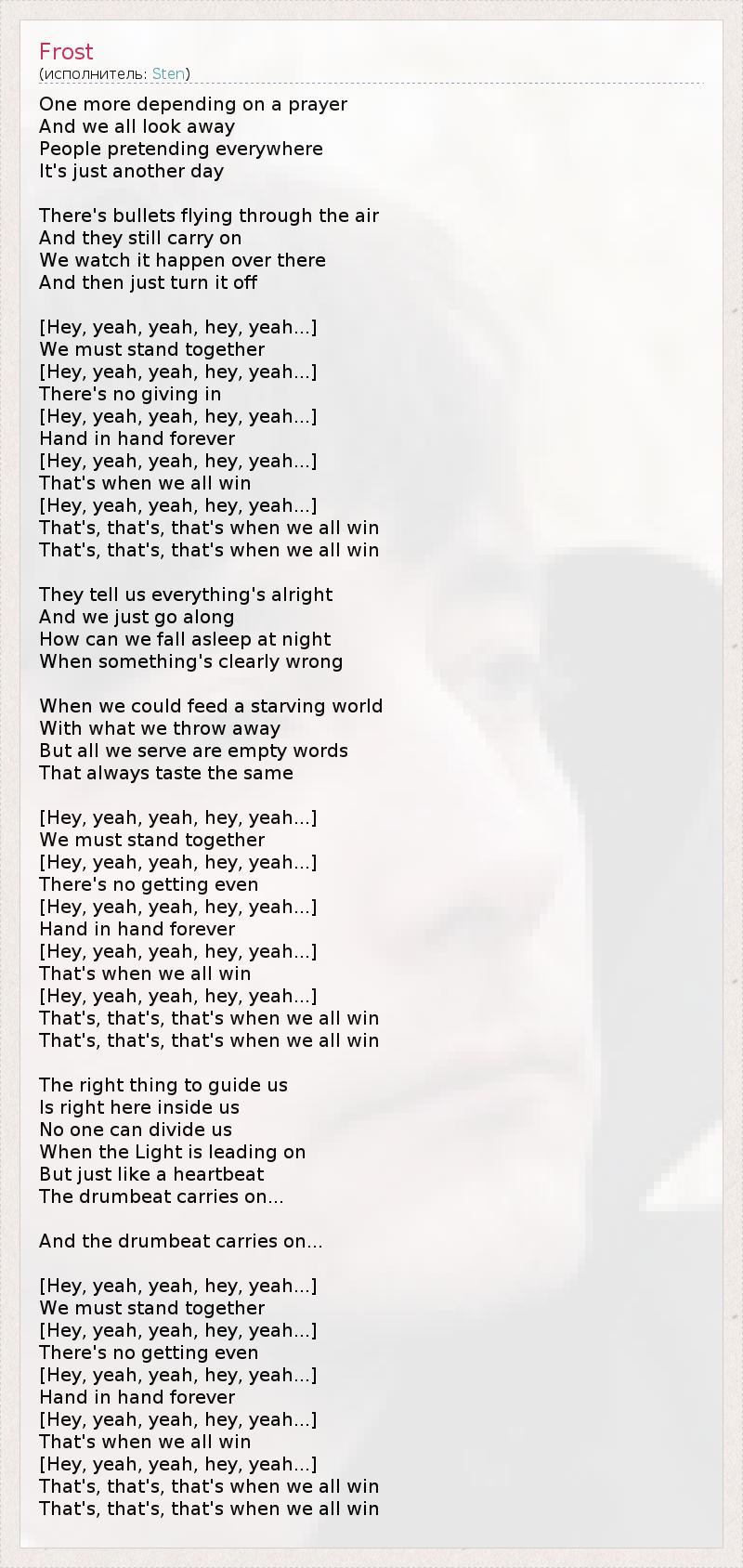 One more depending on a prayer And we all look away People pretending everywhere It's just another day There's bullets flying through the air And they still carry on We watch it happen over there And then just turn it off [Hey, yeah, yeah, hey, yeah...] We must stand together [Hey, yeah, yeah, hey, yeah...] Тhere's no giving in [Hey, yeah, yeah, hey, yeah...] Hand in hand forever [Hey, yeah, yeah, hey, yeah...] That's when we all win [Hey, yeah, yeah, hey, yeah...] That's, that's, that's when we all win That's, that's, that's when we all win They tell us everything's alright And we just go along How can we fall asleep at night When something's clearly wrong When we could feed a starving world With what we throw away But all we serve are empty words That always taste the same [Hey, yeah, yeah, hey, yeah...] We must stand together [Hey, yeah, yeah, hey, yeah...] There's no getting even [Hey, yeah, yeah, hey, yeah...] Hand in hand forever [Hey, yeah, yeah, hey, yeah...] That's when we all win [Hey, yeah, yeah, hey, yeah...] That's, that's, that's when we all win That's, that's, that's when we all win The right thing to guide us Is right here inside us No one can divide us When the Light is leading on But just like a heartbeat The drumbeat carries on... And the drumbeat carries on... [Hey, yeah, yeah, hey, yeah...] We must stand together [Hey, yeah, yeah, hey, yeah...] There's no getting even [Hey, yeah, yeah, hey, yeah...] Hand in hand forever [Hey, yeah, yeah, hey, yeah...] That's when we all win [Hey, yeah, yeah, hey, yeah...] That's, that's, that's when we all win That's, that's, that's when we all win