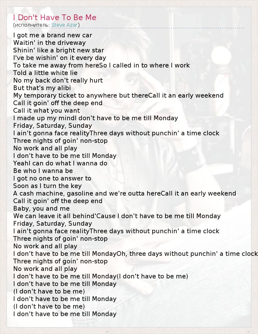 I got me a brand new car Waitin' in the driveway Shinin' like a bright new star I've be wishin' on it every day To take me away from hereSo I called in to where I work Told a little white lie No my back don't really hurt But that's my alibi My temporary ticket to anywhere but thereCall it an early weekend Call it goin' off the deep end Call it what you want I made up my mindI don't have to be me till Monday Friday, Saturday, Sunday I ain't gonna face realityThree days without punchin' a time clock Three nights of goin' non-stop No work and all play I don't have to be me till Monday YeahI can do what I wanna do Be who I wanna be I got no one to answer to Soon as I turn the key A cash machine, gasoline and we're outta hereCall it an early weekend Call it goin' off the deep end Baby, you and me We can leave it all behind'Cause I don't have to be me till Monday Friday, Saturday, Sunday I ain't gonna face realityThree days without punchin' a time clock Three nights of goin' non-stop No work and all play I don't have to be me till MondayOh, three days without punchin' a time clock Three nights of goin' non-stop No work and all play I don't have to be me till Monday(I don't have to be me) I don't have to be me till Monday (I don't have to be me) I don't have to be me till Monday (I don't have to be me) I don't have to be me till Monday