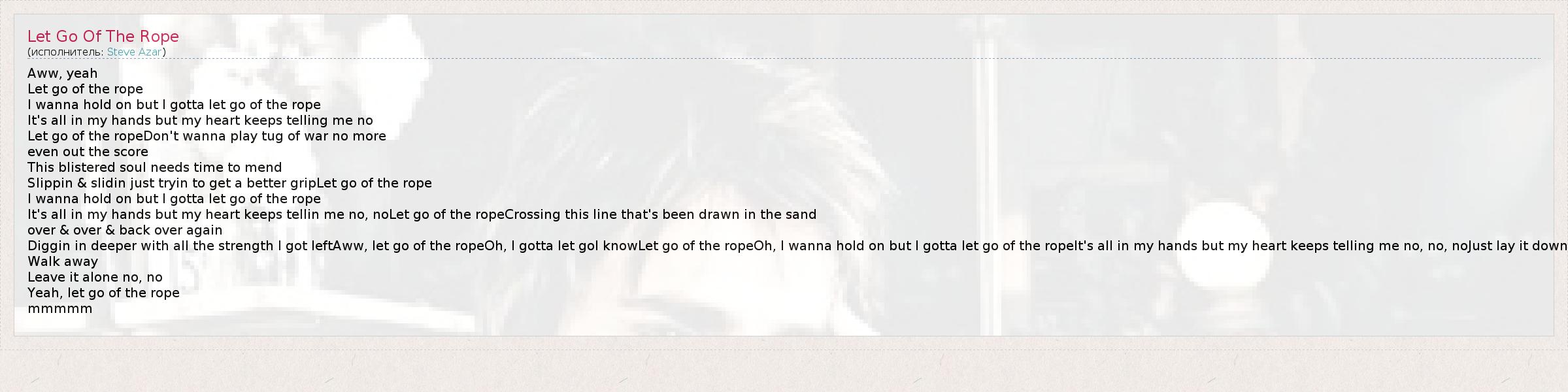 Aww, yeah Let go of the rope I wanna hold on but I gotta let go of the rope It's all in my hands but my heart keeps telling me no Let go of the ropeDon't wanna play tug of war no more even out the score This blistered soul needs time to mend Slippin & slidin just tryin to get a better gripLet go of the rope I wanna hold on but I gotta let go of the rope It's all in my hands but my heart keeps tellin me no, noLet go of the ropeCrossing this line that's been drawn in the sand over & over & back over again Diggin in deeper with all the strength I got leftAww, let go of the ropeOh, I gotta let goI knowLet go of the ropeOh, I wanna hold on but I gotta let go of the ropeIt's all in my hands but my heart keeps telling me no, no, noJust lay it down Walk away Leave it alone no, no Yeah, let go of the rope mmmmm