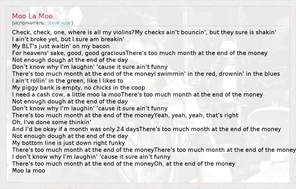 Check, check, one, where is all my violins?My checks ain't bouncin', but they sure is shakin' I ain't broke yet, but I sure am breakin' My BLT's just waitin' on my bacon For heavens' sake, good, good graciousThere's too much month at the end of the money Not enough dough at the end of the day Don't know why I'm laughin' 'cause it sure ain't funny There's too much month at the end of the moneyI swimmin' in the red, drownin' in the blues I ain't rollin' in the green, like I likes to My piggy bank is empty, no chicks in the coop I need a cash cow, a little moo la mooThere's too much month at the end of the money Not enough dough at the end of the day Don't know why I'm laughin' 'cause it sure ain't funny There's too much month at the end of the moneyYeah, yeah, yeah, that's right Oh, I've done some thinkin' And I'd be okay if a month was only 24 daysThere's too much month at the end of the money Not enough dough at the end of the day My bottom line is just down right funky There's too much month at the end of the moneyThere's too much month at the end of the money I don't know why I'm laughin' 'cause it sure ain't funny There's too much month at the end of the moneyOh, at the end of the money Moo la moo