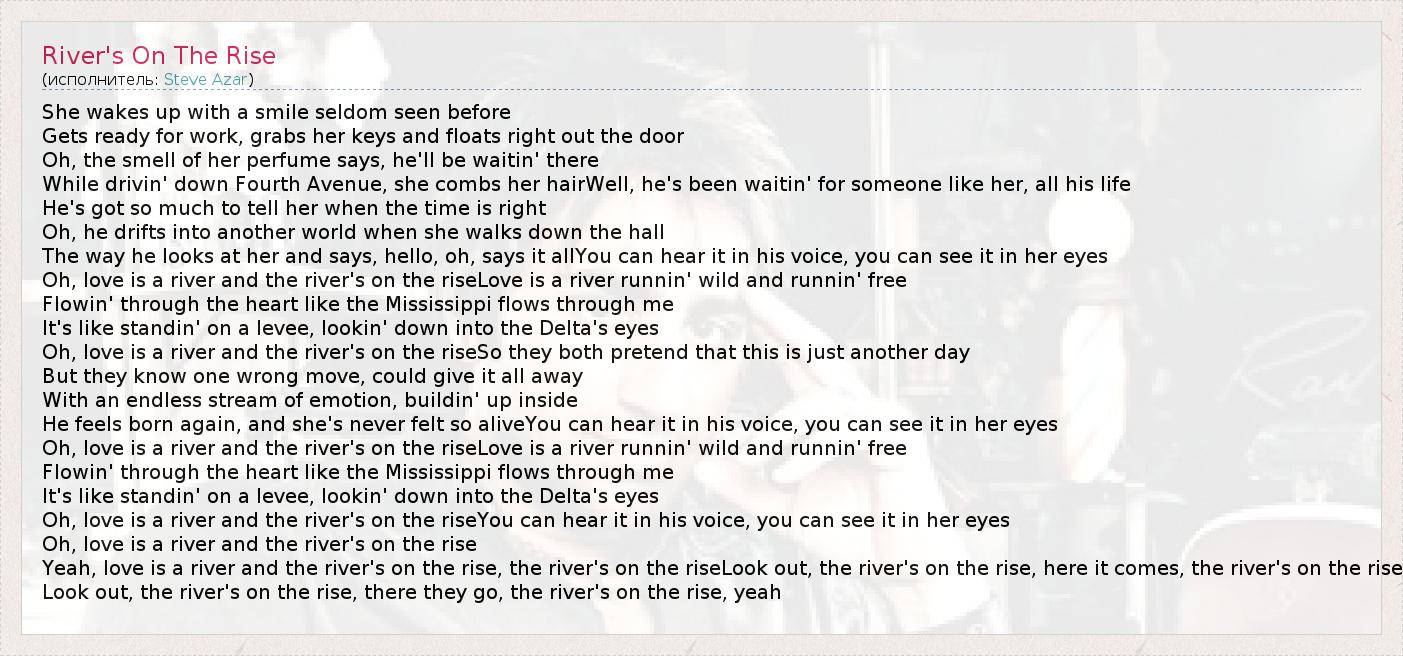 She wakes up with a smile seldom seen before Gets ready for work, grabs her keys and floats right out the door Oh, the smell of her perfume says, he'll be waitin' there While drivin' down Fourth Avenue, she combs her hairWell, he's been waitin' for someone like her, all his life He's got so much to tell her when the time is right Oh, he drifts into another world when she walks down the hall The way he looks at her and says, hello, oh, says it allYou can hear it in his voice, you can see it in her eyes Oh, love is a river and the river's on the riseLove is a river runnin' wild and runnin' free Flowin' through the heart like the Mississippi flows through me It's like standin' on a levee, lookin' down into the Delta's eyes Oh, love is a river and the river's on the riseSo they both pretend that this is just another day But they know one wrong move, could give it all away With an endless stream of emotion, buildin' up inside He feels born again, and she's never felt so aliveYou can hear it in his voice, you can see it in her eyes Oh, love is a river and the river's on the riseLove is a river runnin' wild and runnin' free Flowin' through the heart like the Mississippi flows through me It's like standin' on a levee, lookin' down into the Delta's eyes Oh, love is a river and the river's on the riseYou can hear it in his voice, you can see it in her eyes Oh, love is a river and the river's on the rise Yeah, love is a river and the river's on the rise, the river's on the riseLook out, the river's on the rise, here it comes, the river's on the rise Look out, the river's on the rise, there they go, the river's on the rise, yeah