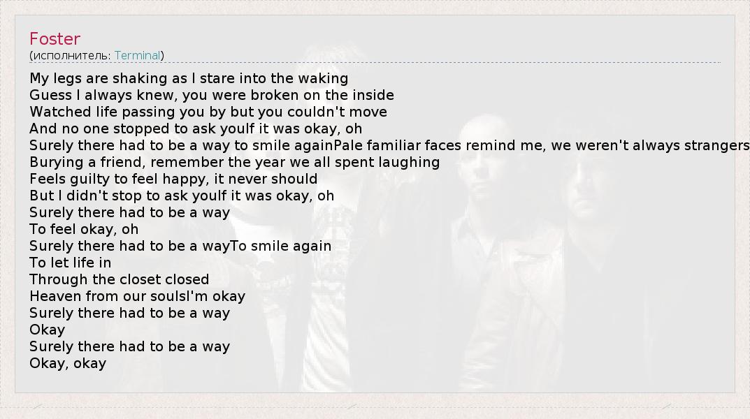 My legs are shaking as I stare into the waking Guess I always knew, you were broken on the inside Watched life passing you by but you couldn't move And no one stopped to ask youIf it was okay, oh Surely there had to be a way to smile againPale familiar faces remind me, we weren't always strangers Burying a friend, remember the year we all spent laughing Feels guilty to feel happy, it never should But I didn't stop to ask youIf it was okay, oh Surely there had to be a way To feel okay, oh Surely there had to be a wayTo smile again To let life in Through the closet closed Heaven from our soulsI'm okay Surely there had to be a way Okay Surely there had to be a way Okay, okay