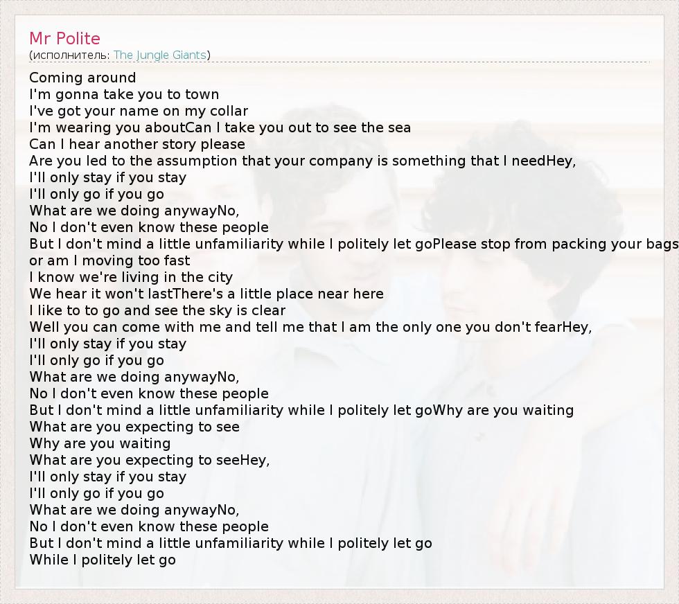 Coming around I'm gonna take you to town I've got your name on my collar I'm wearing you aboutCan I take you out to see the sea Can I hear another story please Are you led to the assumption that your company is something that I needHey, I'll only stay if you stay I'll only go if you go What are we doing anywayNo, No I don't even know these people But I don't mind a little unfamiliarity while I politely let goPlease stop from packing your bags or am I moving too fast I know we're living in the city We hear it won't lastThere's a little place near here I like to to go and see the sky is clear Well you can come with me and tell me that I am the only one you don't fearHey, I'll only stay if you stay I'll only go if you go What are we doing anywayNo, No I don't even know these people But I don't mind a little unfamiliarity while I politely let goWhy are you waiting What are you expecting to see Why are you waiting What are you expecting to seeHey, I'll only stay if you stay I'll only go if you go What are we doing anywayNo, No I don't even know these people But I don't mind a little unfamiliarity while I politely let go While I politely let go