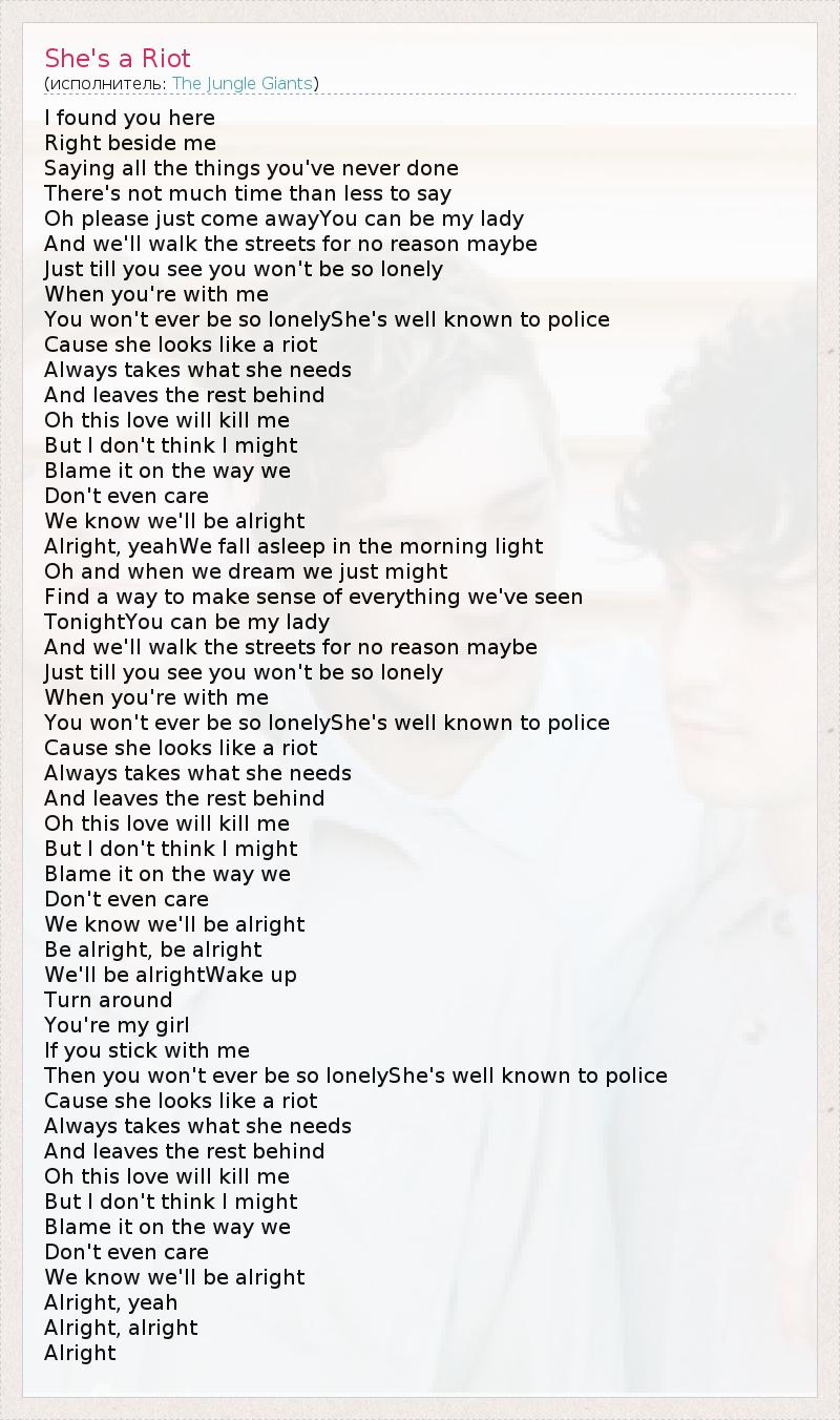 I found you here Right beside me Saying all the things you've never done There's not much time than less to say Oh please just come awayYou can be my lady And we'll walk the streets for no reason maybe Just till you see you won't be so lonely When you're with me You won't ever be so lonelyShe's well known to police Cause she looks like a riot Always takes what she needs And leaves the rest behind Oh this love will kill me But I don't think I might Blame it on the way we Don't even care We know we'll be alright Alright, yeahWe fall asleep in the morning light Oh and when we dream we just might Find a way to make sense of everything we've seen TonightYou can be my lady And we'll walk the streets for no reason maybe Just till you see you won't be so lonely When you're with me You won't ever be so lonelyShe's well known to police Cause she looks like a riot Always takes what she needs And leaves the rest behind Oh this love will kill me But I don't think I might Blame it on the way we Don't even care We know we'll be alright Be alright, be alright We'll be alrightWake up Turn around You're my girl If you stick with me Then you won't ever be so lonelyShe's well known to police Cause she looks like a riot Always takes what she needs And leaves the rest behind Oh this love will kill me But I don't think I might Blame it on the way we Don't even care We know we'll be alright Alright, yeah Alright, alright Alright
