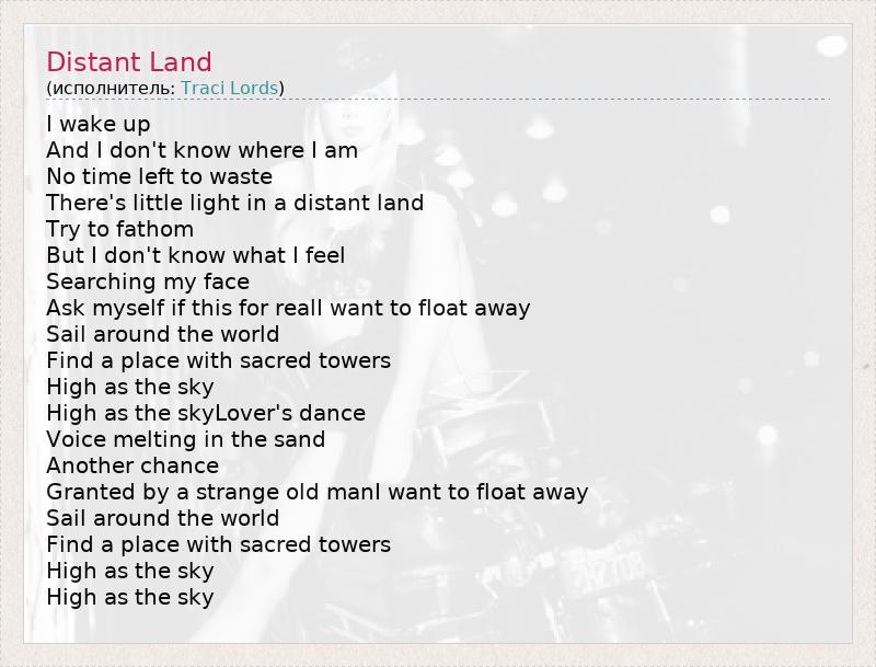 I wake up And I don't know where I am No time left to waste There's little light in a distant land Try to fathom But I don't know what I feel Searching my face Ask myself if this for realI want to float away Sail around the world Find a place with sacred towers High as the sky High as the skyLover's dance Voice melting in the sand Another chance Granted by a strange old manI want to float away Sail around the world Find a place with sacred towers High as the sky High as the sky
