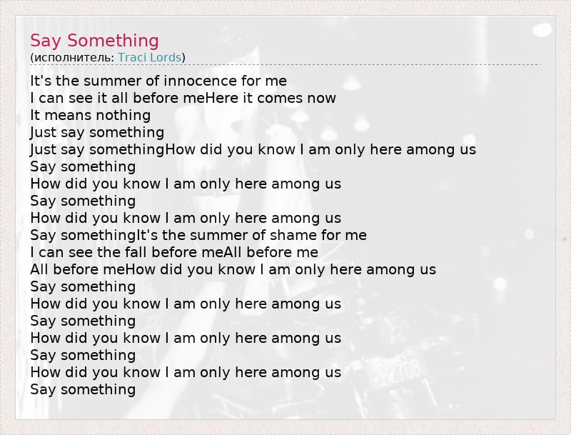It's the summer of innocence for me I can see it all before meHere it comes now It means nothing Just say something Just say somethingHow did you know I am only here among us Say something How did you know I am only here among us Say something How did you know I am only here among us Say somethingIt's the summer of shame for me I can see the fall before meAll before me All before meHow did you know I am only here among us Say something How did you know I am only here among us Say something How did you know I am only here among us Say something How did you know I am only here among us Say something