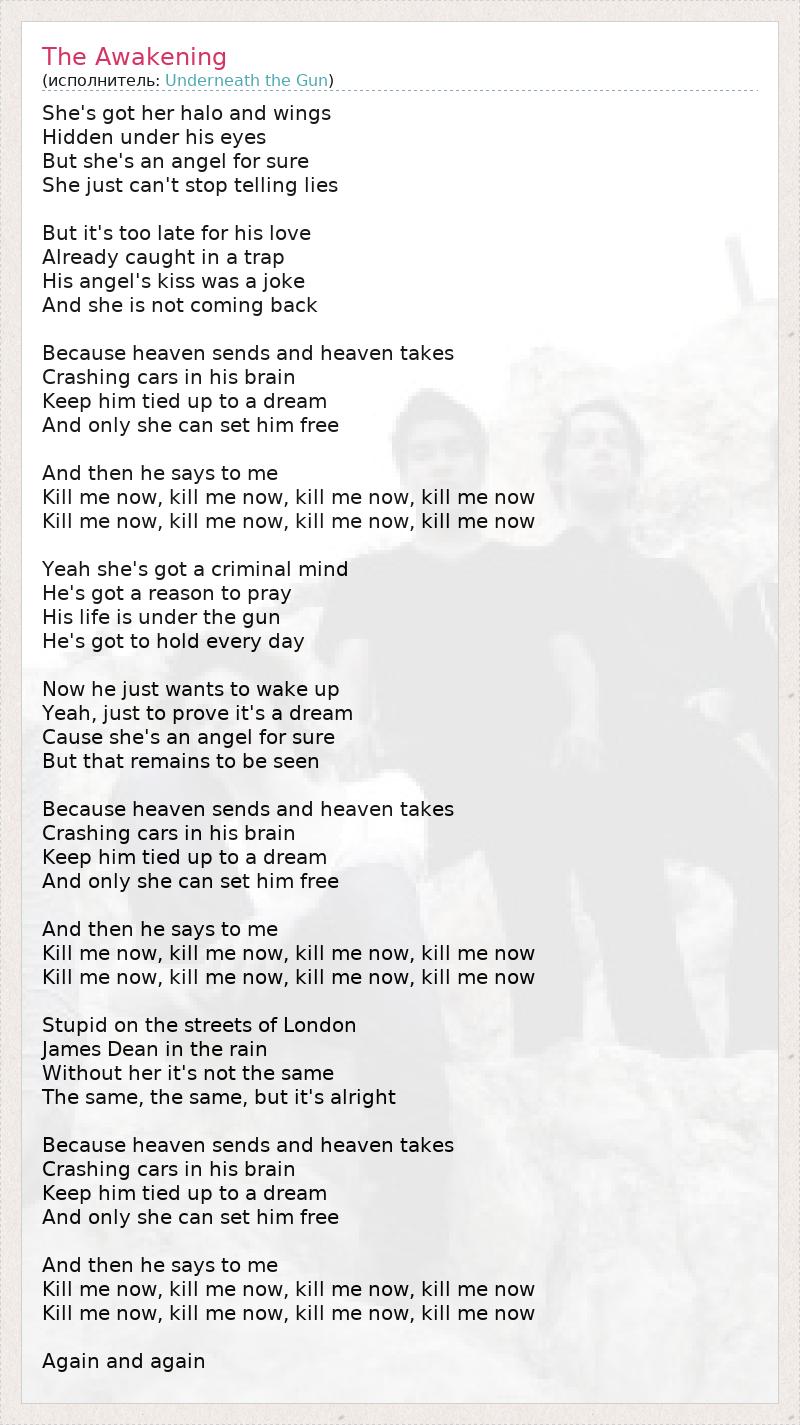 У неё есть свой ореол и крылья, Спрятанные от его глаз, Но она - ангел, наверняка, Просто она никак не может прекратить врать. Но слишком поздно для его любви, Уже пойманный в ловушку, Поцелуй ангела был шуткой, И она не возвращается обратно. Потому что Бог дал, Бог взял, Автомобильная авария стоит у него перед глазами, Держит его привязанным к своей мечте, И только она может освободить его. И потом он говорит мне: Убей меня теперь, убей меня теперь, убей меня теперь, убей меня теперь. Убей меня теперь, убей меня теперь, убей меня теперь, убей меня теперь. Да, она обладает мышлением преступника, У него есть причина молиться, Его жизнь находится под прицелом, Он вынужден пытаться выжить каждый день. Теперь он хочет просто проснуться, Чтобы доказать это - только мечта Потому что она - ангел, наверняка, Но это ещё неизвестно. Потому что Бог дал, Бог взял, Автомобильная авария стоит у него перед глазами, Держит его привязанным к своей мечте, И только она может освободить его. И потом он говорит мне: Убей меня теперь, убей меня теперь, убей меня теперь, убей меня теперь. Убей меня теперь, убей меня теперь, убей меня теперь, убей меня теперь. Идиоты на улицах Лондона, Джеймс Дин под дождём, Без нее это не то же самое, То же самое, то же самое, но зато всё в порядке. Потому что Бог дал, Бог взял, Автомобильная авария стоит у него перед глазами, Держит его привязанным к своей мечте, И только она может освободить его. И потом он говорит мне: Убей меня теперь, убей меня теперь, убей меня теперь, убей меня теперь. Убей меня теперь, убей меня теперь, убей меня теперь, убей меня теперь. Снова и снова...