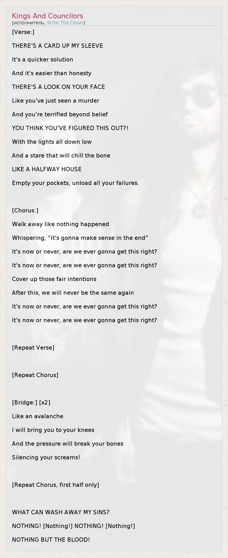 [Verse:] THERE'S A CARD UP MY SLEEVE It's a quicker solution And it's easier than honesty THERE'S A LOOK ON YOUR FACE Like you've just seen a murder And you're terrified beyond belief YOU THINK YOU'VE FIGURED THIS OUT?! With the lights all down low And a stare that will chill the bone LIKE A HALFWAY HOUSE Empty your pockets, unload all your failures. [Chorus:] Walk away like nothing happened Whispering, "it's gonna make sense in the end" It's now or never, are we ever gonna get this right? It's now or never, are we ever gonna get this right? Cover up those fair intentions After this, we will never be the same again It's now or never, are we ever gonna get this right? It's now or never, are we ever gonna get this right? [Repeat Verse] [Repeat Chorus] [Bridge:] [x2] Like an avalanche I will bring you to your knees And the pressure will break your bones Silencing your screams! [Repeat Chorus, first half only] WHAT CAN WASH AWAY MY SINS? NOTHING! [Nothing!] NOTHING! [Nothing!] NOTHING BUT THE BLOOD!