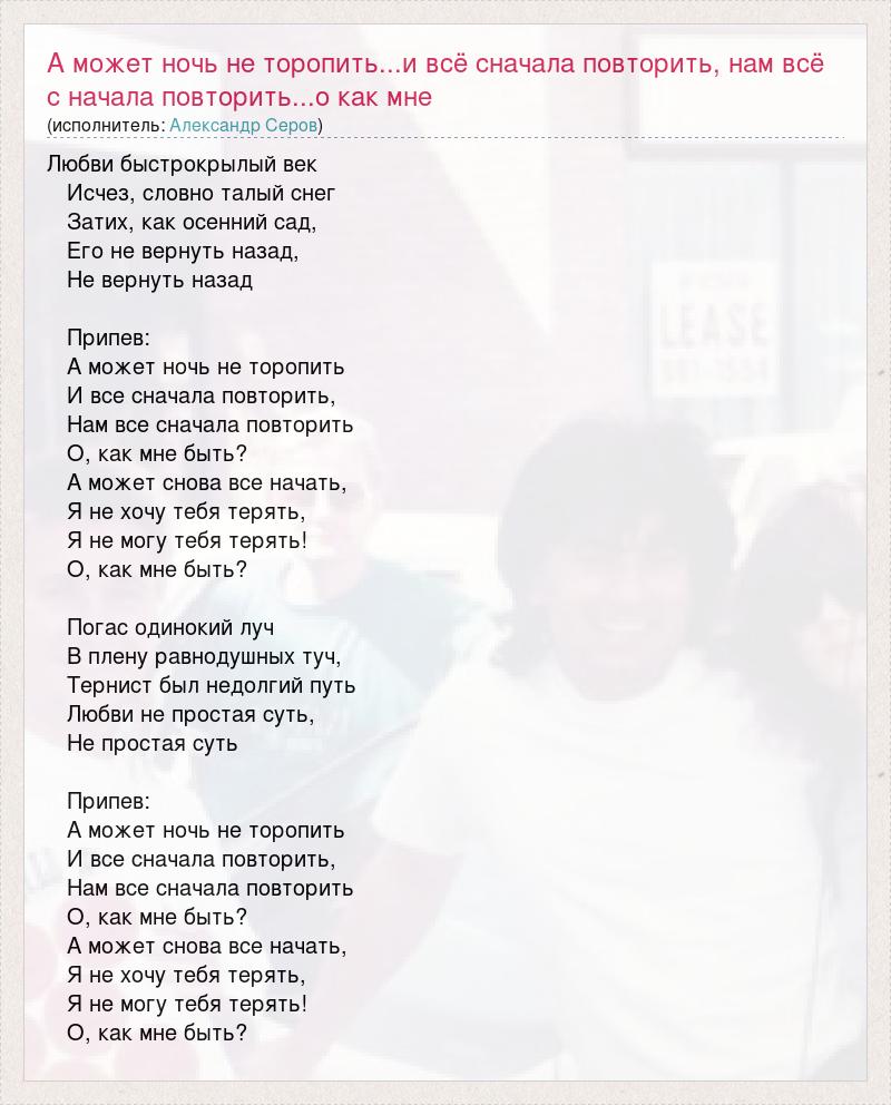 Главная→Исполнители→Александр Серов→А может ночь не торопить...и всё сначала повторить, нам всё с начала по