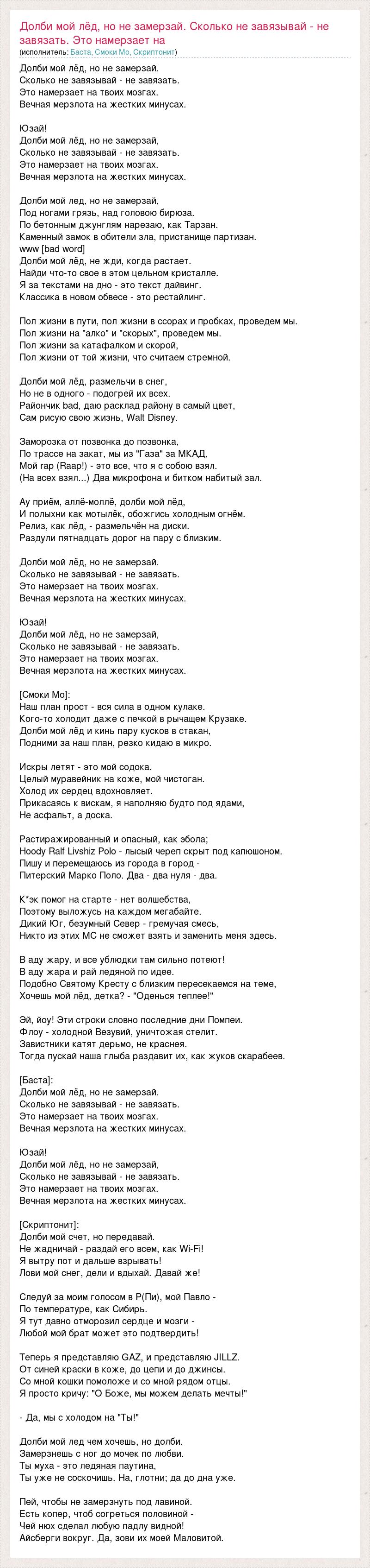 Долби мой лёд, но не замерзай. Сколько не завязывай - не завязать. Это намерзает на твоих мозгах. Вечная мерзлота на жестких минусах. Юзай! Долби мой лёд, но не замерзай, Сколько не завязывай - не завязать. Это намерзает на твоих мозгах. Вечная мерзлота на жестких минусах. Долби мой лед, но не замерзай, Под ногами грязь, над головою бирюза. По бетонным джунглям нарезаю, как Тарзан. Каменный замок в обители зла, пристанище партизан. www [bad word] Долби мой лёд, не жди, когда растает. Найди что-то свое в этом цельном кристалле. Я за текстами на дно - это текст дайвинг. Классика в новом обвесе - это рестайлинг. Пол жизни в пути, пол жизни в ссорах и пробках, проведем мы. Пол жизни на "алко" и "скорых", проведем мы. Пол жизни за катафалком и скорой, Пол жизни от той жизни, что считаем стремной. Долби мой лёд, размельчи в снег, Но не в одного - подогрей их всех. Райончик bad, даю расклад району в самый цвет, Сам рисую свою жизнь, Walt Disney. Заморозка от позвонка до позвонка, По трассе на закат, мы из "Газа" за МКАД, Мой rap (Raap!) - это все, что я с собою взял. (На всех взял...) Два микрофона и битком набитый зал. Ау приём, аллё-моллё, долби мой лёд, И полыхни как мотылёк, обожгись холодным огнём. Релиз, как лёд, - размельчён на диски. Раздули пятнадцать дорог на пару с близким. Долби мой лёд, но не замерзай. Сколько не завязывай - не завязать. Это намерзает на твоих мозгах. Вечная мерзлота на жестких минусах. Юзай! Долби мой лёд, но не замерзай, Сколько не завязывай - не завязать. Это намерзает на твоих мозгах. Вечная мерзлота на жестких минусах. [Смоки Мо]: Наш план прост - вся сила в одном кулаке. Кого-то холодит даже с печкой в рычащем Крузаке. Долби мой лёд и кинь пару кусков в стакан, Подними за наш план, резко кидаю в микро. Искры летят - это мой содока. Целый муравейник на коже, мой чистоган. Холод их сердец вдохновляет. Прикасаясь к вискам, я наполняю будто под ядами, Не асфальт, а доска. Растиражированный и опасный, как эбола; Hoody Ralf Livshiz Polo - лысый череп скрыт под капюшоном. Пишу и перемещаюсь из города в город - Питерский Марко Поло. Два - два нуля - два. К*эк помог на старте - нет волшебства, Поэтому выложусь на каждом мегабайте. Дикий Юг, безумный Север - гремучая смесь, Никто из этих МС не сможет взять и заменить меня здесь. В аду жару, и все ублюдки там сильно потеют! В аду жара и рай ледяной по идее. Подобно Святому Кресту с близким пересекаемся на теме, Хочешь мой лёд, детка? - "Оденься теплее!" Эй, йоу! Эти строки словно последние дни Помпеи. Флоу - холодной Везувий, уничтожая стелит. Завистники катят дерьмо, не краснея. Тогда пускай наша глыба раздавит их, как жуков скарабеев. [Баста]: Долби мой лёд, но не замерзай. Сколько не завязывай - не завязать. Это намерзает на твоих мозгах. Вечная мерзлота на жестких минусах. Юзай! Долби мой лёд, но не замерзай, Сколько не завязывай - не завязать. Это намерзает на твоих мозгах. Вечная мерзлота на жестких минусах. [Скриптонит]: Долби мой счет, но передавай. Не жадничай - раздай его всем, как Wi-Fi! Я вытру пот и дальше взрывать! Лови мой снег, дели и вдыхай. Давай же! Следуй за моим голосом в P(Пи), мой Павло - По температуре, как Сибирь. Я тут давно отморозил сердце и мозги - Любой мой брат может это подтвердить! Теперь я представляю GAZ, и представляю JILLZ. От синей краски в коже, до цепи и до джинсы. Со мной кошки помоложе и со мной рядом отцы. Я просто кричу: "О Боже, мы можем делать мечты!