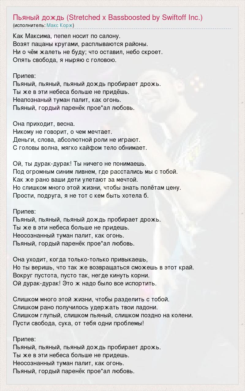 Как Максима, пепел носит по салону. Возят пацаны кругами, расплываются районы. Ни о чём жалеть не буду; что оставил, небо скроет. Опять свобода, я ныряю с головою. Припев: Пьяный, пьяный, пьяный дождь пробирает дрожь. Ты же в эти небеса больше не придёшь. Неапознаный туман палит, как огонь. Пьяный, гордый паренёк прое*ал любовь. Она приходит, весна. Никому не говорит, о чем мечтает. Деньги, слова, абсолютной роли не играют. С головы волна, мягко кайфом тело обнимает. Ой, ты дурак-дурак! Ты ничего не понимаешь. Под огромным синим ливнем, где расстались мы с тобой. Как же рано ваши дети улетают за мечтой. Но слишком много этой жизни, чтобы знать полётам цену. Прости, подруга, я не тот с кем быть хотела б. Припев: Пьяный, пьяный, пьяный дождь пробирает дрожь. Ты же в эти небеса больше не придешь. Неосознанный туман палит, как огонь. Пьяный, гордый паренёк прое*ал любовь. Она уходит, когда только-только привыкаешь, Но ты веришь, что так же возвращаться сможешь в этот край. Вокруг пустота, пусто так, негде кинуть корни. Ой дурак-дурак! Это ж надо было все испортить. Слишком много этой жизни, чтобы разделить с тобой. Слишком рано получилось удержать твои ладони. Слишком глупый, слишком пьяный, слишком поздно на колени. Пусти свобода, сука, от тебя одни проблемы! Припев: Пьяный, пьяный, пьяный дождь пробирает дрожь. Ты же в эти небеса больше не придешь. Неосознанный туман палит, как огонь. Пьяный, гордый паренёк прое*ал любовь.