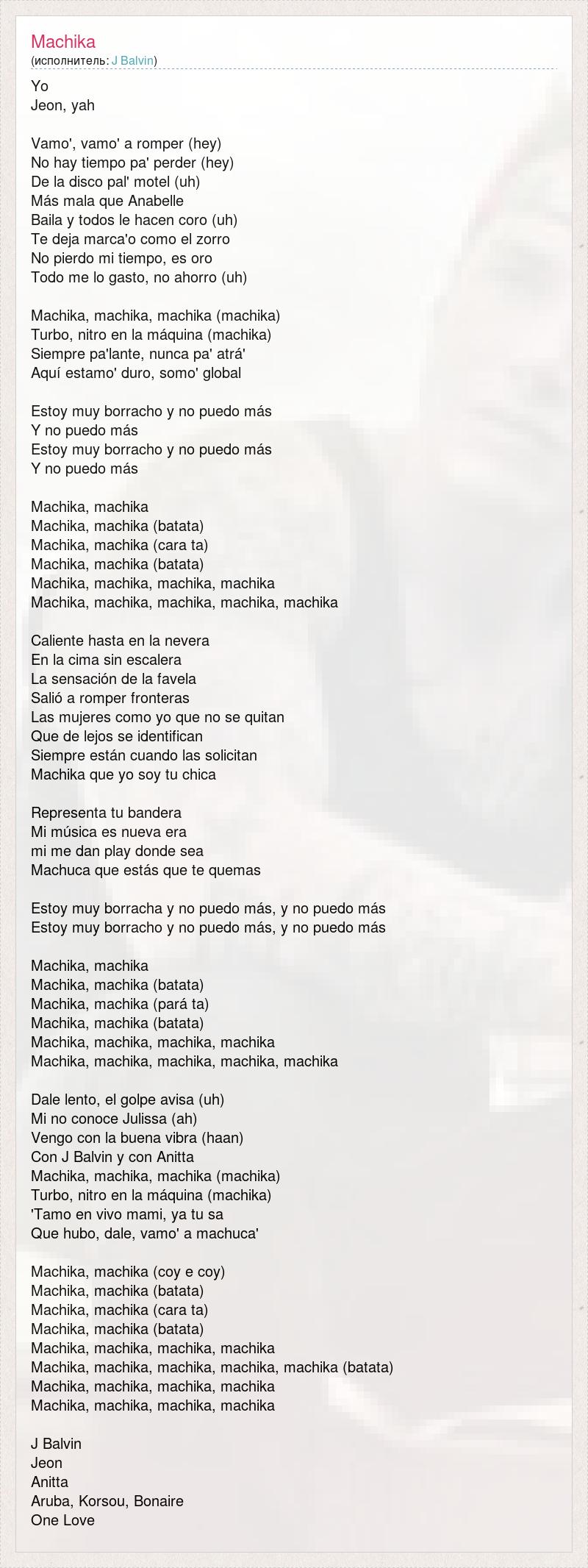 Yo Jeon, yah Vamo', vamo' a romper (hey) No hay tiempo pa' perder (hey) De la disco pal' motel (uh) Más mala que Anabelle Baila y todos le hacen coro (uh) Te deja marca'o como el zorro No pierdo mi tiempo, es oro Todo me lo gasto, no ahorro (uh) Machika, machika, machika (machika) Turbo, nitro en la máquina (machika) Siempre pa'lante, nunca pa' atrá' Aquí estamo' duro, somo' global Estoy muy borracho y no puedo más Y no puedo más Estoy muy borracho y no puedo más Y no puedo más Machika, machika Machika, machika (batata) Machika, machika (cara ta) Machika, machika (batata) Machika, machika, machika, machika Machika, machika, machika, machika, machika Caliente hasta en la nevera En la cima sin escalera La sensación de la favela Salió a romper fronteras Las mujeres como yo que no se quitan Que de lejos se identifican Siempre están cuando las solicitan Machika que yo soy tu chica Representa tu bandera Mi música es nueva era mi me dan play donde sea Machuca que estás que te quemas Estoy muy borracha y no puedo más, y no puedo más Estoy muy borracho y no puedo más, y no puedo más Machika, machika Machika, machika (batata) Machika, machika (pará ta) Machika, machika (batata) Machika, machika, machika, machika Machika, machika, machika, machika, machika Dale lento, el golpe avisa (uh) Mi no conoce Julissa (ah) Vengo con la buena vibra (haan) Con J Balvin y con Anitta Machika, machika, machika (machika) Turbo, nitro en la máquina (machika) 'Tamo en vivo mami, ya tu sa Que hubo, dale, vamo' a machuca' Machika, machika (coy e coy) Machika, machika (batata) Machika, machika (cara ta) Machika, machika (batata) Machika, machika, machika, machika Machika, machika, machika, machika, machika (batata) Machika, machika, machika, machika Machika, machika, machika, machika J Balvin Jeon Anitta Aruba, Korsou, Bonaire One Love