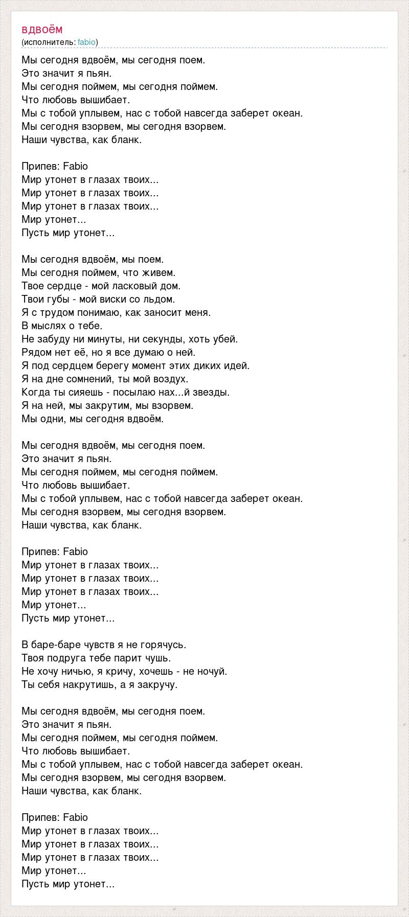 Мы сегодня вдвоём, мы сегодня поем. Это значит я пьян. Мы сегодня поймем, мы сегодня поймем. Что любовь вышибает. Мы с тобой уплывем, нас с тобой навсегда заберет океан. Мы сегодня взорвем, мы сегодня взорвем. Наши чувства, как бланк. Припев: Fabio Мир утонет в глазах твоих... Мир утонет в глазах твоих... Мир утонет в глазах твоих... Мир утонет... Пусть мир утонет... Мы сегодня вдвоём, мы поем. Мы сегодня поймем, что живем. Твое сердце - мой ласковый дом. Твои губы - мой виски со льдом. Я с трудом понимаю, как заносит меня. В мыслях о тебе. Не забуду ни минуты, ни секунды, хоть убей. Рядом нет её, но я все думаю о ней. Я под сердцем берегу момент этих диких идей. Я на дне сомнений, ты мой воздух. Когда ты сияешь - посылаю нах...й звезды. Я на ней, мы закрутим, мы взорвем. Мы одни, мы сегодня вдвоём. Мы сегодня вдвоём, мы сегодня поем. Это значит я пьян. Мы сегодня поймем, мы сегодня поймем. Что любовь вышибает. Мы с тобой уплывем, нас с тобой навсегда заберет океан. Мы сегодня взорвем, мы сегодня взорвем. Наши чувства, как бланк. Припев: Fabio Мир утонет в глазах твоих... Мир утонет в глазах твоих... Мир утонет в глазах твоих... Мир утонет... Пусть мир утонет... В баре-баре чувств я не горячусь. Твоя подруга тебе парит чушь. Не хочу ничью, я кричу, хочешь - не ночуй. Ты себя накрутишь, а я закручу. Мы сегодня вдвоём, мы сегодня поем. Это значит я пьян. Мы сегодня поймем, мы сегодня поймем. Что любовь вышибает. Мы с тобой уплывем, нас с тобой навсегда заберет океан. Мы сегодня взорвем, мы сегодня взорвем. Наши чувства, как бланк. Припев: Fabio Мир утонет в глазах твоих... Мир утонет в глазах твоих... Мир утонет в глазах твоих... Мир утонет... Пусть мир утонет...