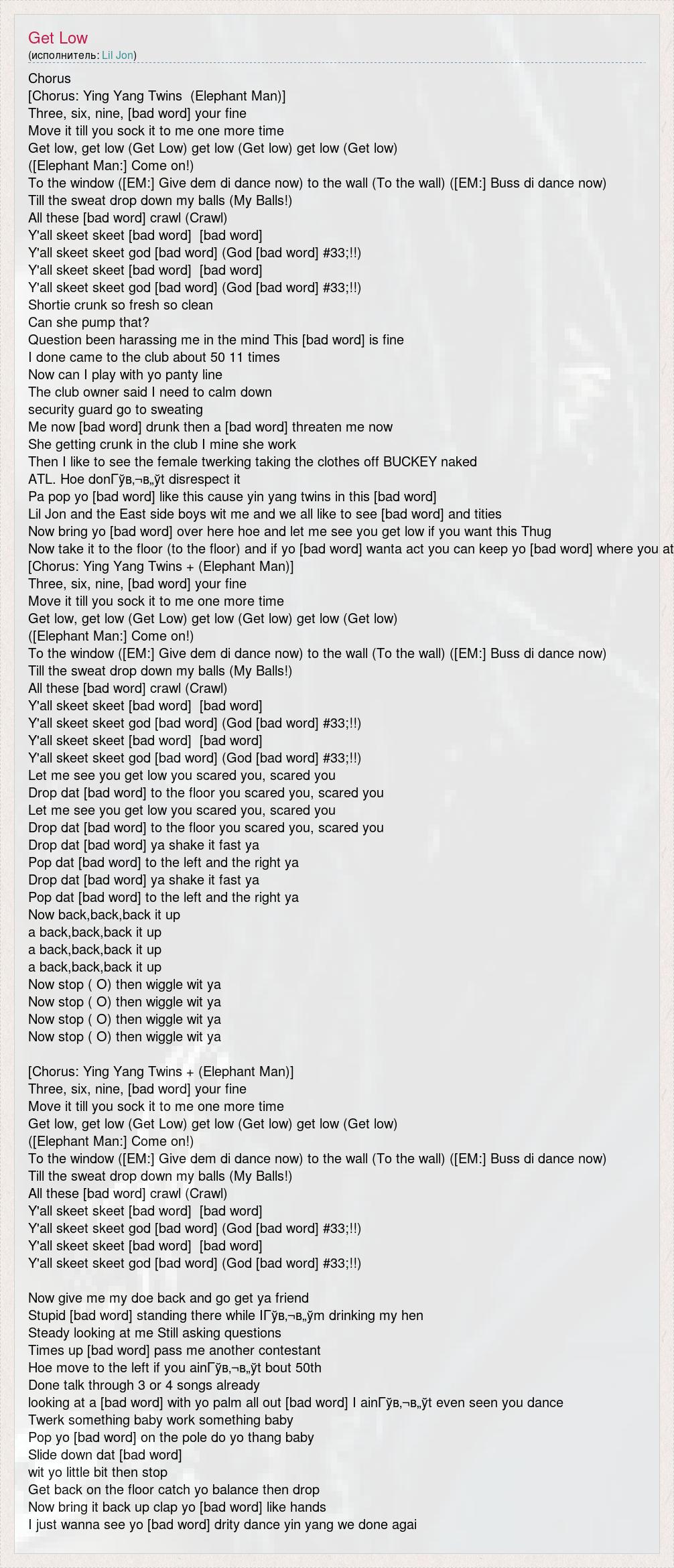 Chorus [Chorus: Ying Yang Twins (Elephant Man)] Three, six, nine, [bad word] your fine Move it till you sock it to me one more time Get low, get low (Get Low) get low (Get low) get low (Get low) ([Elephant Man:] Come on!) To the window ([EM:] Give dem di dance now) to the wall (To the wall) ([EM:] Buss di dance now) Till the sweat drop down my balls (My Balls!) All these [bad word] crawl (Crawl) Y'all skeet skeet [bad word] [bad word] Y'all skeet skeet god [bad word] (God [bad word] #33;!!) Y'all skeet skeet [bad word] [bad word] Y'all skeet skeet god [bad word] (God [bad word] #33;!!) Shortie crunk so fresh so clean Can she pump that? Question been harassing me in the mind This [bad word] is fine I done came to the club about 50 11 times Now can I play with yo panty line The club owner said I need to calm down security guard go to sweating Me now [bad word] drunk then a [bad word] threaten me now She getting crunk in the club I mine she work Then I like to see the female twerking taking the clothes off BUCKEY naked ATL. Hoe don’t disrespect it Pa pop yo [bad word] like this cause yin yang twins in this [bad word] Lil Jon and the East side boys wit me and we all like to see [bad word] and tities Now bring yo [bad word] over here hoe and let me see you get low if you want this Thug Now take it to the floor (to the floor) and if yo [bad word] wanta act you can keep yo [bad word] where you at [Chorus: Ying Yang Twins + (Elephant Man)] Three, six, nine, [bad word] your fine Move it till you sock it to me one more time Get low, get low (Get Low) get low (Get low) get low (Get low) ([Elephant Man:] Come on!) To the window ([EM:] Give dem di dance now) to the wall (To the wall) ([EM:] Buss di dance now) Till the sweat drop down my balls (My Balls!) All these [bad word] crawl (Crawl) Y'all skeet skeet [bad word] [bad word] Y'all skeet skeet god [bad word] (God [bad word] #33;!!) Y'all skeet skeet [bad word] [bad word] Y'all skeet skeet god [bad word] (God [bad word] #33;!!) Let me see you get low you scared you, scared you Drop dat [bad word] to the floor you scared you, scared you Let me see you get low you scared you, scared you Drop dat [bad word] to the floor you scared you, scared you Drop dat [bad word] ya shake it fast ya Pop dat [bad word] to the left and the right ya Drop dat [bad word] ya shake it fast ya Pop dat [bad word] to the left and the right ya Now back,back,back it up a back,back,back it up a back,back,back it up a back,back,back it up Now stop ( O) then wiggle wit ya Now stop ( O) then wiggle wit ya Now stop ( O) then wiggle wit ya Now stop ( O) then wiggle wit ya [Chorus: Ying Yang Twins + (Elephant Man)] Three, six, nine, [bad word] your fine Move it till you sock it to me one more time Get low, get low (Get Low) get low (Get low) get low (Get low) ([Elephant Man:] Come on!) To the window ([EM:] Give dem di dance now) to the wall (To the wall) ([EM:] Buss di dance now) Till the sweat drop down my balls (My Balls!) All these [bad word] crawl (Crawl) Y'all skeet skeet [bad word] [bad word] Y'all skeet skeet god [bad word] (God [bad word] #33;!!) Y'all skeet skeet [bad word] [bad word] Y'all skeet skeet god [bad word] (God [bad word] #33;!!) Now give me my doe back and go get ya friend Stupid [bad word] standing there while I’m drinking my hen Steady looking at me Still asking questions Times up [bad word] pass me another contestant Hoe move to the left if you ain’t bout 50th Done talk through 3 or 4 songs already looking at a [bad word] with yo palm all out [bad word] I ain’t even seen you dance Twerk something baby work something baby Pop yo [bad word] on the pole do yo thang baby Slide down dat [bad word] wit yo little bit then stop Get back on the floor catch yo balance then drop Now bring it back up clap yo [bad word] like hands I just wanna see yo [bad word] drity dance yin yang we done agai