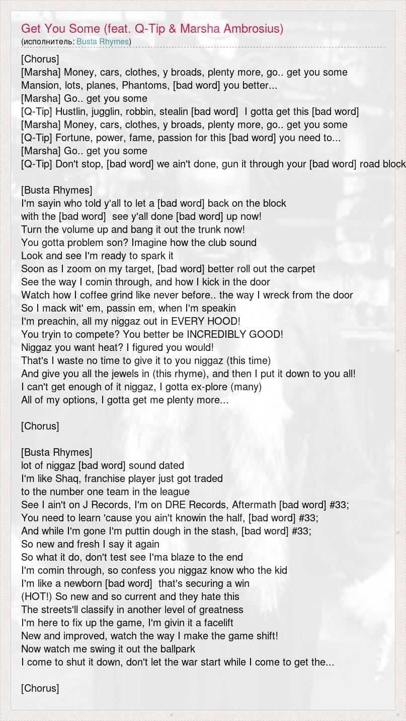 [Chorus] [Marsha] Money, cars, clothes, y broads, plenty more, go.. get you some Mansion, lots, planes, Phantoms, [bad word] you better... [Marsha] Go.. get you some [Q-Tip] Hustlin, jugglin, robbin, stealin [bad word] I gotta get this [bad word] [Marsha] Money, cars, clothes, y broads, plenty more, go.. get you some [Q-Tip] Fortune, power, fame, passion for this [bad word] you need to... [Marsha] Go.. get you some [Q-Tip] Don't stop, [bad word] we ain't done, gun it through your [bad word] road block [Busta Rhymes] I'm sayin who told y'all to let a [bad word] back on the block with the [bad word] see y'all done [bad word] up now! Turn the volume up and bang it out the trunk now! You gotta problem son? Imagine how the club sound Look and see I'm ready to spark it Soon as I zoom on my target, [bad word] better roll out the carpet See the way I comin through, and how I kick in the door Watch how I coffee grind like never before.. the way I wreck from the door So I mack wit' em, passin em, when I'm speakin I'm preachin, all my niggaz out in EVERY HOOD! You tryin to compete? You better be INCREDIBLY GOOD! Niggaz you want heat? I figured you would! That's I waste no time to give it to you niggaz (this time) And give you all the jewels in (this rhyme), and then I put it down to you all! I can't get enough of it niggaz, I gotta ex-plore (many) All of my options, I gotta get me plenty more... [Chorus] [Busta Rhymes] lot of niggaz [bad word] sound dated I'm like Shaq, franchise player just got traded to the number one team in the league See I ain't on J Records, I'm on DRE Records, Aftermath [bad word] #33; You need to learn 'cause you ain't knowin the half, [bad word] #33; And while I'm gone I'm puttin dough in the stash, [bad word] #33; So new and fresh I say it again So what it do, don't test see I'ma blaze to the end I'm comin through, so confess you niggaz know who the kid I'm like a newborn [bad word] that's securing a win (HOT!) So new and so current and they hate this The streets'll classify in another level of greatness I'm here to fix up the game, I'm givin it a facelift New and improved, watch the way I make the game shift! Now watch me swing it out the ballpark I come to shut it down, don't let the war start while I come to get the... [Chorus]