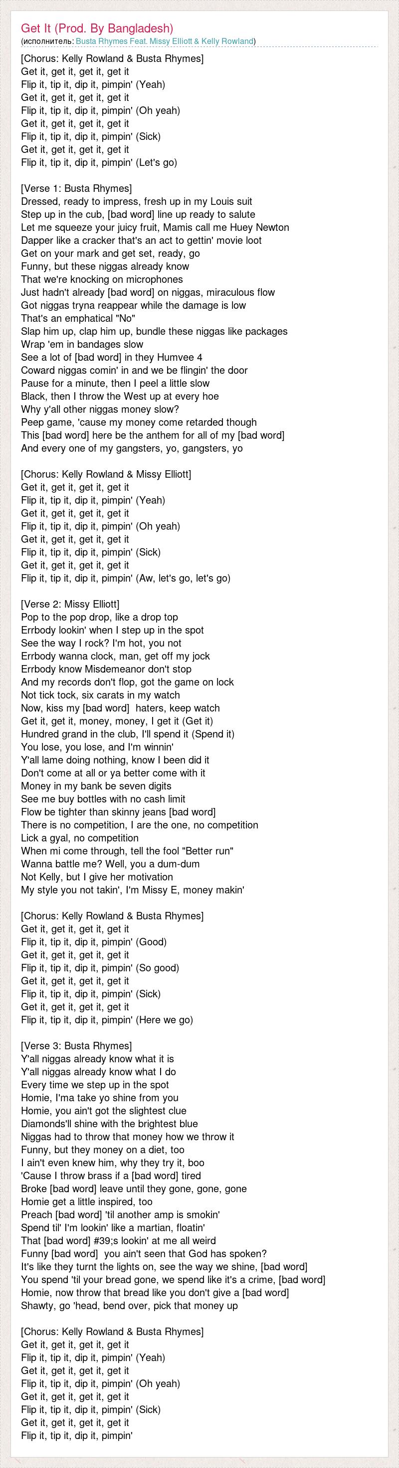 [Chorus: Kelly Rowland & Busta Rhymes] Get it, get it, get it, get it Flip it, tip it, dip it, pimpin' (Yeah) Get it, get it, get it, get it Flip it, tip it, dip it, pimpin' (Oh yeah) Get it, get it, get it, get it Flip it, tip it, dip it, pimpin' (Sick) Get it, get it, get it, get it Flip it, tip it, dip it, pimpin' (Let's go) [Verse 1: Busta Rhymes] Dressed, ready to impress, fresh up in my Louis suit Step up in the cub, [bad word] line up ready to salute Let me squeeze your juicy fruit, Mamis call me Huey Newton Dapper like a cracker that's an act to gettin' movie loot Get on your mark and get set, ready, go Funny, but these niggas already know That we're knocking on microphones Just hadn't already [bad word] on niggas, miraculous flow Got niggas tryna reappear while the damage is low That's an emphatical "No" Slap him up, clap him up, bundle these niggas like packages Wrap 'em in bandages slow See a lot of [bad word] in they Humvee 4 Coward niggas comin' in and we be flingin' the door Pause for a minute, then I peel a little slow Black, then I throw the West up at every hoe Why y'all other niggas money slow? Peep game, 'cause my money come retarded though This [bad word] here be the anthem for all of my [bad word] And every one of my gangsters, yo, gangsters, yo [Chorus: Kelly Rowland & Missy Elliott] Get it, get it, get it, get it Flip it, tip it, dip it, pimpin' (Yeah) Get it, get it, get it, get it Flip it, tip it, dip it, pimpin' (Oh yeah) Get it, get it, get it, get it Flip it, tip it, dip it, pimpin' (Sick) Get it, get it, get it, get it Flip it, tip it, dip it, pimpin' (Aw, let's go, let's go) [Verse 2: Missy Elliott] Pop to the pop drop, like a drop top Errbody lookin' when I step up in the spot See the way I rock? I'm hot, you not Errbody wanna clock, man, get off my jock Errbody know Misdemeanor don't stop And my records don't flop, got the game on lock Not tick tock, six carats in my watch Now, kiss my [bad word] haters, keep watch Get it, get it, money, money, I get it (Get it) Hundred grand in the club, I'll spend it (Spend it) You lose, you lose, and I'm winnin' Y'all lame doing nothing, know I been did it Don't come at all or ya better come with it Money in my bank be seven digits See me buy bottles with no cash limit Flow be tighter than skinny jeans [bad word] There is no competition, I are the one, no competition Lick a gyal, no competition When mi come through, tell the fool "Better run" Wanna battle me? Well, you a dum-dum Not Kelly, but I give her motivation My style you not takin', I'm Missy E, money makin' [Chorus: Kelly Rowland & Busta Rhymes] Get it, get it, get it, get it Flip it, tip it, dip it, pimpin' (Good) Get it, get it, get it, get it Flip it, tip it, dip it, pimpin' (So good) Get it, get it, get it, get it Flip it, tip it, dip it, pimpin' (Sick) Get it, get it, get it, get it Flip it, tip it, dip it, pimpin' (Here we go) [Verse 3: Busta Rhymes] Y'all niggas already know what it is Y'all niggas already know what I do Every time we step up in the spot Homie, I'ma take yo shine from you Homie, you ain't got the slightest clue Diamonds'll shine with the brightest blue Niggas had to throw that money how we throw it Funny, but they money on a diet, too I ain't even knew him, why they try it, boo 'Cause I throw brass if a [bad word] tired Broke [bad word] leave until they gone, gone, gone Homie get a little inspired, too Preach [bad word] 'til another amp is smokin' Spend til' I'm lookin' like a martian, floatin' That [bad word] #39;s lookin' at me all weird Funny [bad word] you ain't seen that God has spoken? It's like they turnt the lights on, see the way we shine, [bad word] You spend 'til your bread gone, we spend like it's a crime, [bad word] Homie, now throw that bread like you don't give a [bad word] Shawty, go 'head, bend over, pick that money up [Chorus: Kelly Rowland & Busta Rhymes] Get it, get it, get it, get it Flip it, tip it, dip it, pimpin' (Yeah) Get it, get it, get it, get it Flip it, tip it, dip it, pimpin' (Oh yeah) Get it, get it, get it, get it Flip it, tip it, dip it, pimpin' (Sick) Get it, get it, get it, get it Flip it, tip it, dip it, pimpin'