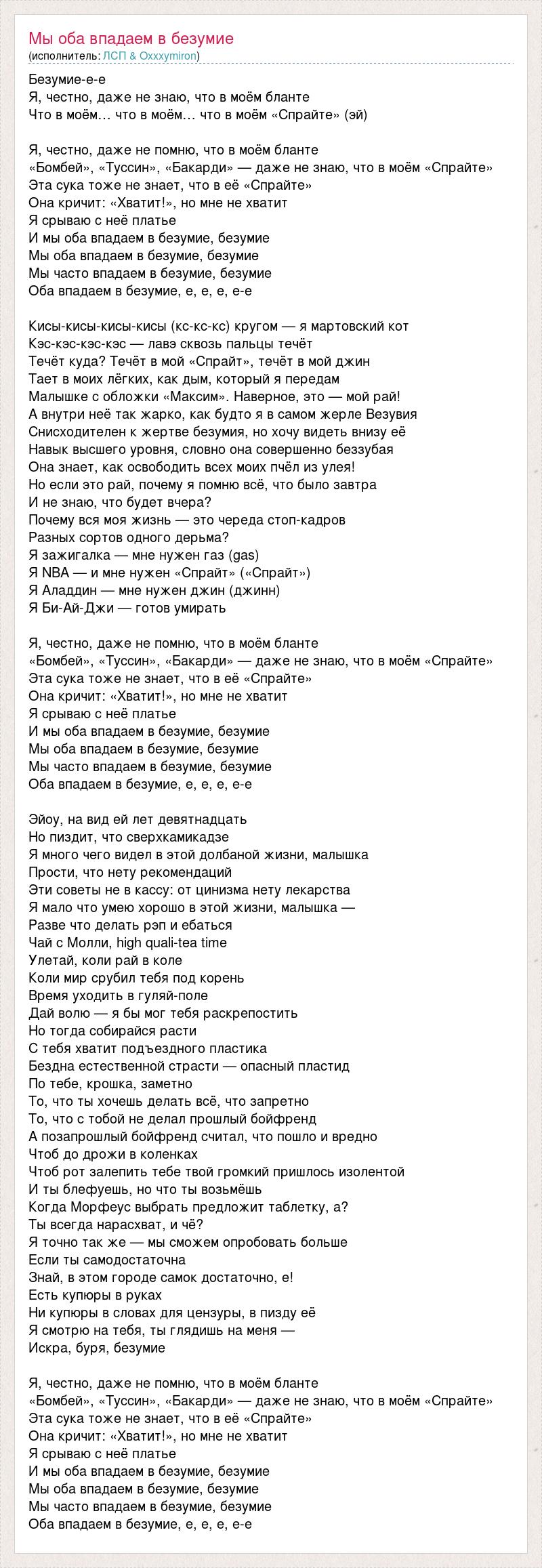 Безумие-е-е Я, честно, даже не знаю, что в моём бланте Что в моём… что в моём… что в моём «Спрайте» (эй) Я, честно, даже не помню, что в моём бланте «Бомбей», «Туссин», «Бакарди» — даже не знаю, что в моём «Спрайте» Эта сука тоже не знает, что в её «Спрайте» Она кричит: «Хватит!», но мне не хватит Я срываю с неё платье И мы оба впадаем в безумие, безумие Мы оба впадаем в безумие, безумие Мы часто впадаем в безумие, безумие Оба впадаем в безумие, е, е, е, е-е Кисы-кисы-кисы-кисы (кс-кс-кс) кругом — я мартовский кот Кэс-кэс-кэс-кэс — лавэ сквозь пальцы течёт Течёт куда? Течёт в мой «Спрайт», течёт в мой джин Тает в моих лёгких, как дым, который я передам Малышке с обложки «Максим». Наверное, это — мой рай! А внутри неё так жарко, как будто я в самом жерле Везувия Снисходителен к жертве безумия, но хочу видеть внизу её Навык высшего уровня, словно она совершенно беззубая Она знает, как освободить всех моих пчёл из улея! Но если это рай, почему я помню всё, что было завтра И не знаю, что будет вчера? Почему вся моя жизнь — это череда стоп-кадров Разных сортов одного дерьма? Я зажигалка — мне нужен газ (gas) Я NBA — и мне нужен «Спрайт» («Спрайт») Я Аладдин — мне нужен джин (джинн) Я Би-Ай-Джи — готов умирать Я, честно, даже не помню, что в моём бланте «Бомбей», «Туссин», «Бакарди» — даже не знаю, что в моём «Спрайте» Эта сука тоже не знает, что в её «Спрайте» Она кричит: «Хватит!», но мне не хватит Я срываю с неё платье И мы оба впадаем в безумие, безумие Мы оба впадаем в безумие, безумие Мы часто впадаем в безумие, безумие Оба впадаем в безумие, е, е, е, е-е Эйоу, на вид ей лет девятнадцать Но пиздит, что сверхкамикадзе Я много чего видел в этой долбаной жизни, малышка Прости, что нету рекомендаций Эти советы не в кассу: от цинизма нету лекарства Я мало что умею хорошо в этой жизни, малышка — Разве что делать рэп и ебаться Чай с Молли, high quali-tea time Улетай, коли рай в коле Коли мир срубил тебя под корень Время уходить в гуляй-поле Дай волю — я бы мог тебя раскрепостить Но тогда собирайся расти С тебя хватит подъездного пластика Бездна естественной страсти — опасный пластид По тебе, крошка, заметно То, что ты хочешь делать всё, что запретно То, что с тобой не делал прошлый бойфренд А позапрошлый бойфренд считал, что пошло и вредно Чтоб до дрожи в коленках Чтоб рот залепить тебе твой громкий пришлось изолентой И ты блефуешь, но что ты возьмёшь Когда Морфеус выбрать предложит таблетку, а? Ты всегда нарасхват, и чё? Я точно так же — мы сможем опробовать больше Если ты самодостаточна Знай, в этом городе самок достаточно, е! Есть купюры в руках Ни купюры в словах для цензуры, в пизду её Я смотрю на тебя, ты глядишь на меня — Искра, буря, безумие Я, честно, даже не помню, что в моём бланте «Бомбей», «Туссин», «Бакарди» — даже не знаю, что в моём «Спрайте» Эта сука тоже не знает, что в её «Спрайте» Она кричит: «Хватит!», но мне не хватит Я срываю с неё платье И мы оба впадаем в безумие, безумие Мы оба впадаем в безумие, безумие Мы часто впадаем в безумие, безумие Оба впадаем в безумие, е, е, е, е-е