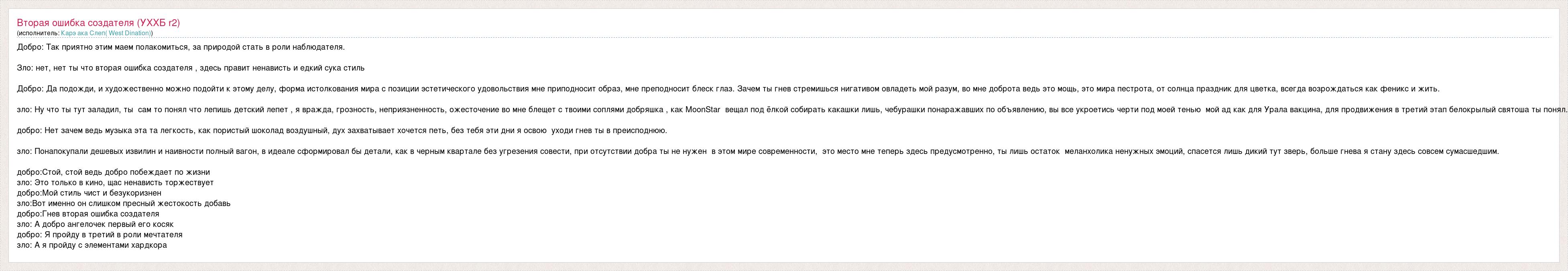 Добро: Так приятно этим маем полакомиться, за природой стать в роли наблюдателя. Зло: нет, нет ты что вторая ошибка создателя , здесь правит ненависть и едкий сука стиль Добро: Да подожди, и художественно можно подойти к этому делу, форма истолкования мира с позиции эстетического удовольствия мне приподносит образ, мне преподносит блеск глаз. Зачем ты гнев стремишься нигативом овладеть мой разум, во мне доброта ведь это мощь, это мира пестрота, от солнца праздник для цветка, всегда возрождаться как феникс и жить. зло: Ну что ты тут заладил, ты сам то понял что лепишь детский лепет , я вражда, грозность, неприязненность, ожесточение во мне блещет с твоими соплями добряшка , как MoonStar вещал под ёлкой собирать какашки лишь, чебурашки понаражавших по объявлению, вы все укроетись черти под моей тенью мой ад как для Урала вакцина, для продвижения в третий этап белокрылый святоша ты понял. добро: Нет зачем ведь музыка эта та легкость, как пористый шоколад воздушный, дух захватывает хочется петь, без тебя эти дни я освою уходи гнев ты в преисподнюю. зло: Понапокупали дешевых извилин и наивности полный вагон, в идеале сформировал бы детали, как в черным квартале без угрезения совести, при отсутствии добра ты не нужен в этом мире современности, это место мне теперь здесь предусмотренно, ты лишь остаток меланхолика ненужных эмоций, спасется лишь дикий тут зверь, больше гнева я стану здесь совсем сумасшедшим. добро:Стой, стой ведь добро побеждает по жизни зло: Это только в кино, щас ненависть торжествует добро:Мой стиль чист и безукоризнен зло:Вот именно он слишком пресный жестокость добавь добро:Гнев вторая ошибка создателя зло: А добро ангелочек первый его косяк добро: Я пройду в третий в роли мечтателя зло: А я пройду с элементами хардкора
