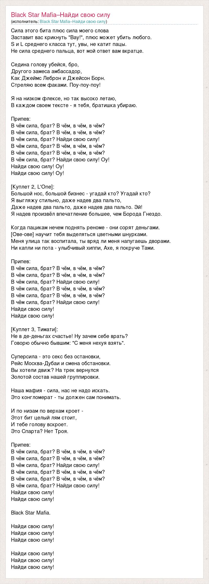 Сила этого бита плюс сила моего слова Заставит вас крикнуть "Вау!", плюс может убить любого. S и L среднего класса тут, увы, не катит пацы. Не сила среднего пальца, вот мой ответ вам вкратце. Седина голову убейся, бро, Другого замеса амбассадор, Как Джеймс Леброн и Джейсон Борн. Стреляю всем факами. Поу-поу-поу! Я на низком флексе, но так высоко летаю, В каждом своем тексте - я тебя, братишка убираю. Припев: В чём сила, брат? В чём, в чём, в чём? В чём сила, брат? В чём, в чём, в чём? В чём сила, брат? Найди свою силу! В чём сила, брат? В чём, в чём, в чём? В чём сила, брат? В чём, в чём, в чём? В чём сила, брат? Найди свою силу! Оу! Найди свою силу! Оу! Найди свою силу! Оу! [Куплет 2, L'One]: Большой нос, большой бизнес - угадай кто? Угадай кто? Я выгляжу стильно, даже надев два пальто, Даже надев два пальто, даже надев два пальто. Эй! Я надев произвёл впечатление большее, чем Борода Гнездо. Когда пацикам нечем поднять реноме - они сорят деньгами. [Ове-ове] научит тебя выделяться цветными шнурками. Меня улица так воспитала, ты вряд ли меня напугаешь дворами. Ни капли ни пота - улыбчивый хиппи, Axe, я покруче Тами. Припев: В чём сила, брат? В чём, в чём, в чём? В чём сила, брат? В чём, в чём, в чём? В чём сила, брат? Найди свою силу! В чём сила, брат? В чём, в чём, в чём? В чём сила, брат? В чём, в чём, в чём? В чём сила, брат? Найди свою силу! Найди свою силу! Найди свою силу! [Куплет 3, Тимати]: Не в де-деньгах счастье! Ну зачем себе врать? Говорю обычно бывшим: "С меня нехуя взять". Суперсила - это секс без остановки, Рейс Москва-Дубаи и смена обстановки. Вы хотели движ? На трек вернулся Золотой состав нашей группировки. Наша мафия - сила, нас не надо искать. Это конгломерат - ты должен сам понимать. И по низам по верхам кроет - Этот бит целый лям стоит, И тебе голову вскроет. Это Спарта? Нет Троя. Припев: В чём сила, брат? В чём, в чём, в чём? В чём сила, брат? В чём, в чём, в чём? В чём сила, брат? Найди свою силу! В чём сила, брат? В чём, в чём, в чём? В чём сила, брат? В чём, в чём, в чём? В чём сила, брат? Найди свою силу! Найди свою силу! Найди свою силу! Black Star Mafia. Найди свою силу! Найди свою силу! Найди свою силу! Найди свою силу! Найди свою силу! Найди свою силу!