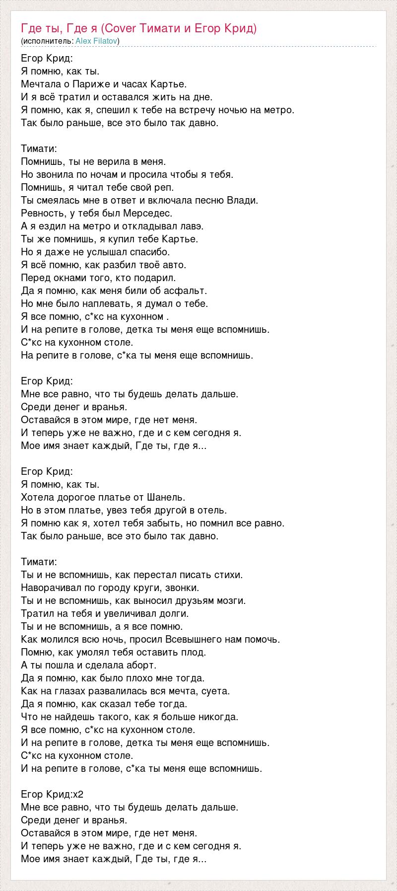 Егор Крид: Я помню, как ты. Мечтала о Париже и часах Картье. И я всё тратил и оставался жить на дне. Я помню, как я, спешил к тебе на встречу ночью на метро. Так было раньше, все это было так давно. Тимати: Помнишь, ты не верила в меня. Но звонила по ночам и просила чтобы я тебя. Помнишь, я читал тебе свой реп. Ты смеялась мне в ответ и включала песню Влади. Ревность, у тебя был Мерседес. А я ездил на метро и откладывал лавэ. Ты же помнишь, я купил тебе Картье. Но я даже не услышал спасибо. Я всё помню, как разбил твоё авто. Перед окнами того, кто подарил. Да я помню, как меня били об асфальт. Но мне было наплевать, я думал о тебе. Я все помню, с*кс на кухонном . И на репите в голове, детка ты меня еще вспомнишь. С*кс на кухонном столе. На репите в голове, с*ка ты меня еще вспомнишь. Егор Крид: Мне все равно, что ты будешь делать дальше. Среди денег и вранья. Оставайся в этом мире, где нет меня. И теперь уже не важно, где и с кем сегодня я. Мое имя знает каждый, Где ты, где я... Егор Крид: Я помню, как ты. Хотела дорогое платье от Шанель. Но в этом платье, увез тебя другой в отель. Я помню как я, хотел тебя забыть, но помнил все равно. Так было раньше, все это было так давно. Тимати: Ты и не вспомнишь, как перестал писать стихи. Наворачивал по городу круги, звонки. Ты и не вспомнишь, как выносил друзьям мозги. Тратил на тебя и увеличивал долги. Ты и не вспомнишь, а я все помню. Как молился всю ночь, просил Всевышнего нам помочь. Помню, как умолял тебя оставить плод. А ты пошла и сделала аборт. Да я помню, как было плохо мне тогда. Как на глазах развалилась вся мечта, суета. Да я помню, как сказал тебе тогда. Что не найдешь такого, как я больше никогда. Я все помню, с*кс на кухонном столе. И на репите в голове, детка ты меня еще вспомнишь. С*кс на кухонном столе. И на репите в голове, с*ка ты меня еще вспомнишь. Егор Крид:х2 Мне все равно, что ты будешь делать дальше. Среди денег и вранья. Оставайся в этом мире, где нет меня. И теперь уже не важно, где и с кем сегодня я. Мое имя знает каждый, Где ты, где я...