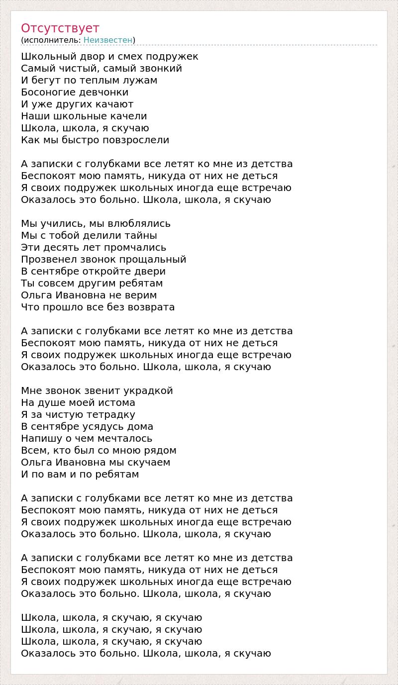 Школьный двор и смех подружек Самый чистый, самый звонкий И бегут по теплым лужам Босоногие девчонки И уже других качают Наши школьные качели Школа, школа, я скучаю Как мы быстро повзрослели А записки с голубками все летят ко мне из детства Беспокоят мою память, никуда от них не деться Я своих подружек школьных иногда еще встречаю Оказалось это больно. Школа, школа, я скучаю Мы учились, мы влюблялись Мы с тобой делили тайны Эти десять лет промчались Прозвенел звонок прощальный В сентябре откройте двери Ты совсем другим ребятам Ольга Ивановна не верим Что прошло все без возврата А записки с голубками все летят ко мне из детства Беспокоят мою память, никуда от них не деться Я своих подружек школьных иногда еще встречаю Оказалось это больно. Школа, школа, я скучаю Мне звонок звенит украдкой На душе моей истома Я за чистую тетрадку В сентябре усядусь дома Напишу о чем мечталось Всем, кто был со мною рядом Ольга Ивановна мы скучаем И по вам и по ребятам А записки с голубками все летят ко мне из детства Беспокоят мою память, никуда от них не деться Я своих подружек школьных иногда еще встречаю Оказалось это больно. Школа, школа, я скучаю А записки с голубками все летят ко мне из детства Беспокоят мою память, никуда от них не деться Я своих подружек школьных иногда еще встречаю Оказалось это больно. Школа, школа, я скучаю Школа, школа, я скучаю, я скучаю Школа, школа, я скучаю, я скучаю Школа, школа, я скучаю, я скучаю Оказалось это больно. Школа, школа, я скучаю