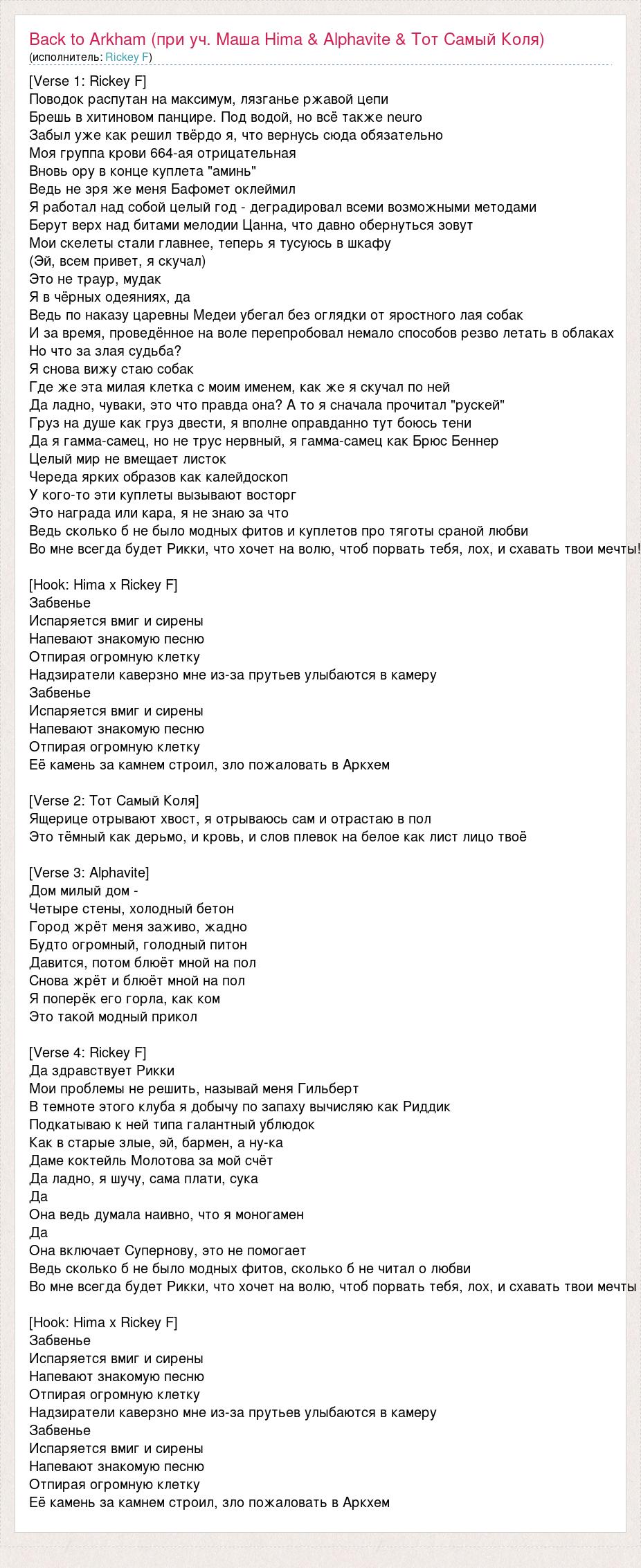 [Verse 1: Rickey F] Поводок распутан на максимум, лязганье ржавой цепи Брешь в хитиновом панцире. Под водой, но всё также neuro Забыл уже как решил твёрдо я, что вернусь сюда обязательно Моя группа крови 664-ая отрицательная Вновь ору в конце куплета "аминь" Ведь не зря же меня Бафомет оклеймил Я работал над собой целый год - деградировал всеми возможными методами Берут верх над битами мелодии Цанна, что давно обернуться зовут Мои скелеты стали главнее, теперь я тусуюсь в шкафу (Эй, всем привет, я скучал) Это не траур, мудак Я в чёрных одеяниях, да Ведь по наказу царевны Медеи убегал без оглядки от яростного лая собак И за время, проведённое на воле перепробовал немало способов резво летать в облаках Но что за злая судьба? Я снова вижу стаю собак Где же эта милая клетка с моим именем, как же я скучал по ней Да ладно, чуваки, это что правда она? А то я сначала прочитал "рускей" Груз на душе как груз двести, я вполне оправданно тут боюсь тени Да я гамма-самец, но не трус нервный, я гамма-самец как Брюс Беннер Целый мир не вмещает листок Череда ярких образов как калейдоскоп У кого-то эти куплеты вызывают восторг Это награда или кара, я не знаю за что Ведь сколько б не было модных фитов и куплетов про тяготы сраной любви Во мне всегда будет Рикки, что хочет на волю, чтоб порвать тебя, лох, и схавать твои мечты! [Hook: Hima x Rickey F] Забвенье Испаряется вмиг и сирены Напевают знакомую песню Отпирая огромную клетку Надзиратели каверзно мне из-за прутьев улыбаются в камеру Забвенье Испаряется вмиг и сирены Напевают знакомую песню Отпирая огромную клетку Её камень за камнем строил, зло пожаловать в Аркхем [Verse 2: Тот Самый Коля] Ящерице отрывают хвост, я отрываюсь сам и отрастаю в пол Это тёмный как дерьмо, и кровь, и слов плевок на белое как лист лицо твоё [Verse 3: Alphavite] Дом милый дом - Четыре стены, холодный бетон Город жрёт меня заживо, жадно Будто огромный, голодный питон Давится, потом блюёт мной на пол Снова жрёт и блюёт мной на пол Я поперёк его горла, как ком Это такой модный прикол [Verse 4: Rickey F] Да здравствует Рикки Мои проблемы не решить, называй меня Гильберт В темноте этого клуба я добычу по запаху вычисляю как Риддик Подкатываю к ней типа галантный ублюдок Как в старые злые, эй, бармен, а ну-ка Даме коктейль Молотова за мой счёт Да ладно, я шучу, сама плати, сука Да Она ведь думала наивно, что я моногамен Да Она включает Супернову, это не помогает Ведь сколько б не было модных фитов, сколько б не читал о любви Во мне всегда будет Рикки, что хочет на волю, чтоб порвать тебя, лох, и схавать твои мечты [Hook: Hima x Rickey F] Забвенье Испаряется вмиг и сирены Напевают знакомую песню Отпирая огромную клетку Надзиратели каверзно мне из-за прутьев улыбаются в камеру Забвенье Испаряется вмиг и сирены Напевают знакомую песню Отпирая огромную клетку Её камень за камнем строил, зло пожаловать в Аркхем