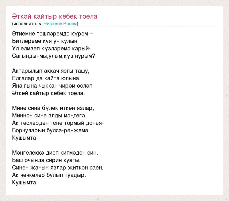 Әтиемне төшләремдә күрәм – Битләремә куя ун кулын Ул елмаеп күзләремә карый- Сагындынмы,улым,күз нурым? Актарылып аккач язгы ташу, Елгалар да кайта юлына. Яңа гына чыккан чирәм өсләп Әткәй кайтыр кебек тоела. Мине сиңа бүләк иткән язлар, Миннән сине алды мәңгегә. Ак төсләрдән генә тормый донья- Борчуларын булса-рәнҗемә. Кушымта Мәңгелеккә диеп китмәден син. Баш очында сирин куагы. Синен җанын язлар җиткән саен, Ак чәчкәләр булып туадыр. Кушымта