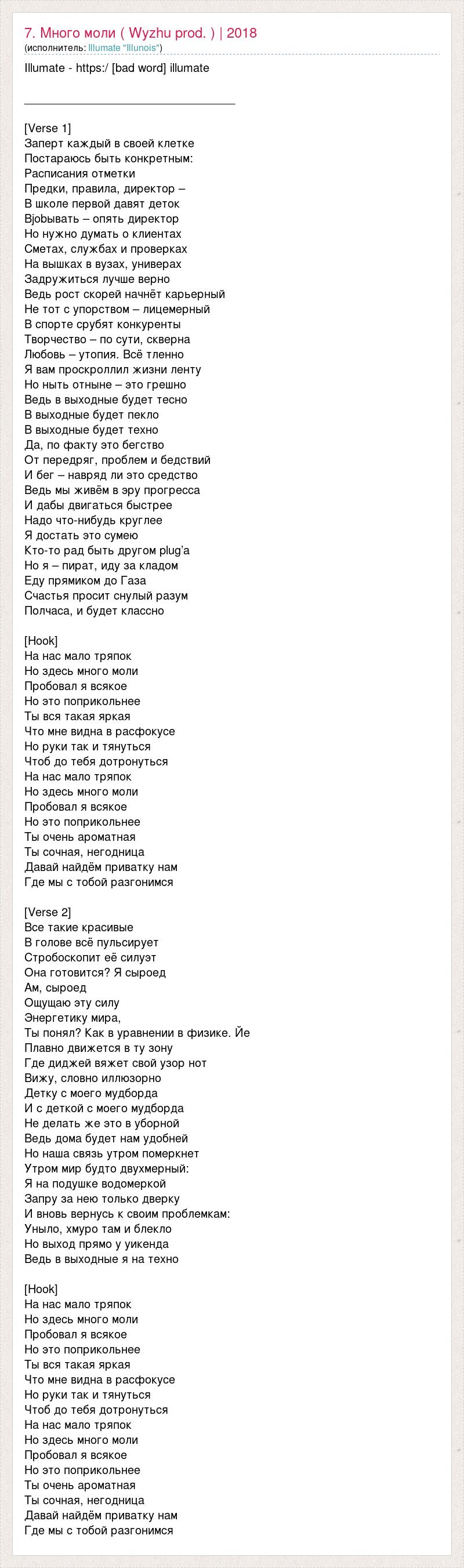 Illumate - https:/ [bad word] illumate _________________________________ [Verse 1] Заперт каждый в своей клетке Постараюсь быть конкретным: Расписания отметки Предки, правила, директор – В школе первой давят деток Вjobывать – опять директор Но нужно думать о клиентах Сметах, службах и проверках На вышках в вузах, универах Задружиться лучше верно Ведь рост скорей начнёт карьерный Не тот с упорством – лицемерный В спорте срубят конкуренты Творчество – по сути, скверна Любовь – утопия. Всё тленно Я вам проскроллил жизни ленту Но ныть отныне – это грешно Ведь в выходные будет тесно В выходные будет пекло В выходные будет техно Да, по факту это бегство От передряг, проблем и бедствий И бег – навряд ли это средство Ведь мы живём в эру прогресса И дабы двигаться быстрее Надо что-нибудь круглее Я достать это сумею Кто-то рад быть другом plug’а Но я – пират, иду за кладом Еду прямиком до Газа Счастья просит снулый разум Полчаса, и будет классно [Hook] На нас мало тряпок Но здесь много моли Пробовал я всякое Но это поприкольнее Ты вся такая яркая Что мне видна в расфокусе Но руки так и тянуться Чтоб до тебя дотронуться На нас мало тряпок Но здесь много моли Пробовал я всякое Но это поприкольнее Ты очень ароматная Ты сочная, негодница Давай найдём приватку нам Где мы с тобой разгонимся [Verse 2] Все такие красивые В голове всё пульсирует Стробоскопит её силуэт Она готовится? Я сыроед Ам, сыроед Ощущаю эту силу Энергетику мира, Ты понял? Как в уравнении в физике. Йе Плавно движется в ту зону Где диджей вяжет свой узор нот Вижу, словно иллюзорно Детку с моего мудборда И с деткой с моего мудборда Не делать же это в уборной Ведь дома будет нам удобней Но наша связь утром померкнет Утром мир будто двухмерный: Я на подушке водомеркой Запру за нею только дверку И вновь вернусь к своим проблемкам: Уныло, хмуро там и блекло Но выход прямо у уикенда Ведь в выходные я на техно [Hook] На нас мало тряпок Но здесь много моли Пробовал я всякое Но это поприкольнее Ты вся такая яркая Что мне видна в расфокусе Но руки так и тянуться Чтоб до тебя дотронуться На нас мало тряпок Но здесь много моли Пробовал я всякое Но это поприкольнее Ты очень ароматная Ты сочная, негодница Давай найдём приватку нам Где мы с тобой разгонимся