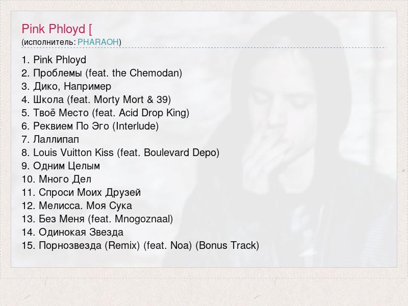 1. Pink Phloyd 2. Проблемы (feat. the Chemodan) 3. Дико, Например 4. Школа (feat. Morty Mort & 39) 5. Твоё Место (feat. Acid Drop King) 6. Реквием По Эго (Interlude) 7. Лаллипап 8. Louis Vuitton Kiss (feat. Boulevard Depo) 9. Одним Целым 10. Много Дел 11. Спроси Моих Друзей 12. Мелисса. Моя Сука 13. Без Меня (feat. Mnogoznaal) 14. Одинокая Звезда 15. Порнозвезда (Remix) (feat. Noa) (Bonus Track)