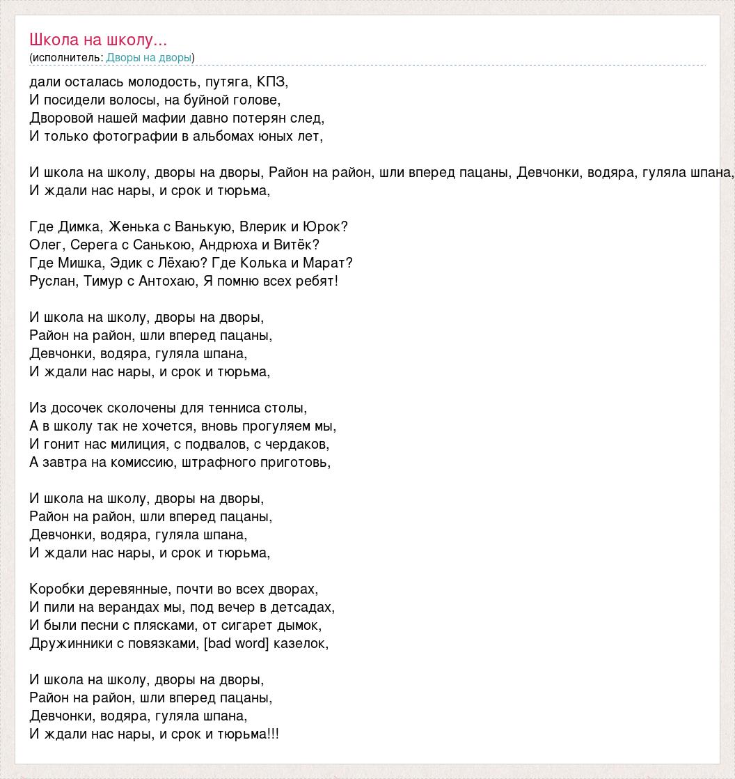 дали осталась молодость, путяга, КПЗ, И посидели волосы, на буйной голове, Дворовой нашей мафии давно потерян след, И только фотографии в альбомах юных лет, И школа на школу, дворы на дворы, Район на район, шли вперед пацаны, Девчонки, водяра, гуляла шпана, И ждали нас нары, и срок и тюрьма, Где Димка, Женька с Ванькую, Влерик и Юрок? Олег, Серега с Санькою, Андрюха и Витёк? Где Мишка, Эдик с Лёхаю? Где Колька и Марат? Руслан, Тимур с Антохаю, Я помню всех ребят! И школа на школу, дворы на дворы, Район на район, шли вперед пацаны, Девчонки, водяра, гуляла шпана, И ждали нас нары, и срок и тюрьма, Из досочек сколочены для тенниса столы, А в школу так не хочется, вновь прогуляем мы, И гонит нас милиция, с подвалов, с чердаков, А завтра на комиссию, штрафного приготовь, И школа на школу, дворы на дворы, Район на район, шли вперед пацаны, Девчонки, водяра, гуляла шпана, И ждали нас нары, и срок и тюрьма, Коробки деревянные, почти во всех дворах, И пили на верандах мы, под вечер в детсадах, И были песни с плясками, от сигарет дымок, Дружинники с повязками, [bad word] казелок, И школа на школу, дворы на дворы, Район на район, шли вперед пацаны, Девчонки, водяра, гуляла шпана, И ждали нас нары, и срок и тюрьма!!!