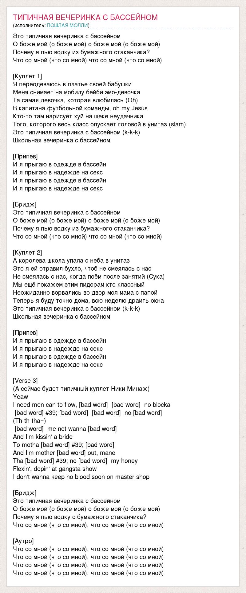 Это типичная вечеринка с бассейном О боже мой (о боже мой) о боже мой (о боже мой) Почему я пью водку из бумажного стаканчика? Что со мной (что со мной) что со мной (что со мной) [Куплет 1] Я переодеваюсь в платье своей бабушки Меня снимает на мобилу бейби эмо-девочка Та самая девочка, которая влюбилась (Oh) В капитана футбольной команды, oh my Jesus Кто-то там нарисует хуй на щеке неудачника Того, которого весь класс опускает головой в унитаз (slam) Это типичная вечеринка с бассейном (k-k-k) Школьная вечеринка с бассейном [Припев] И я прыгаю в одежде в бассейн И я прыгаю в надежде на секс И я прыгаю в одежде в бассейн И я прыгаю в надежде на секс [Бридж] Это типичная вечеринка с бассейном О боже мой (о боже мой) о боже мой (о боже мой) Почему я пью водку из бумажного стаканчика? Что со мной (что со мной) что со мной (что со мной) [Куплет 2] А королева школа упала с неба в унитаз Это я ей отравил бухло, чтоб не смеялась с нас Не смеялась с нас, когда поём после занятий (Сука) Мы ещё покажем этим пидорам кто классный Неожиданно ворвались во двор моя мама с папой Теперь я буду точно дома, всю неделю драить окна Это типичная вечеринка с бассейном (k-k-k) Школьная вечеринка с бассейном [Припев] И я прыгаю в одежде в бассейн И я прыгаю в надежде на секс И я прыгаю в одежде в бассейн И я прыгаю в надежде на секс [Verse 3] (А сейчас будет типичный куплет Ники Минаж) Yeaw I need men can to flow, [bad word] [bad word] no blocka [bad word] #39; [bad word] [bad word] no [bad word] (Th-th-tha~) [bad word] me not wanna [bad word] And I'm kissin' a bride To motha [bad word] #39; [bad word] And I'm mother [bad word] out, mane Tha [bad word] #39; no [bad word] my honey Flexin', dopin' at gangsta show I don't wanna keep no blood soon on master shop [Бридж] Это типичная вечеринка с бассейном О боже мой (о боже мой) о боже мой (о боже мой) Почему я пью водку с бумажного стаканчика? Что со мной (что со мной), что со мной (что со мной) [Аутро] Что со мной (что со мной), что со мной (что со мной) Что со мной (что со мной), что со мной (что со мной) Что со мной (что со мной), что со мной (что со мной) Что со мной (что со мной), что со мной (что со мной)