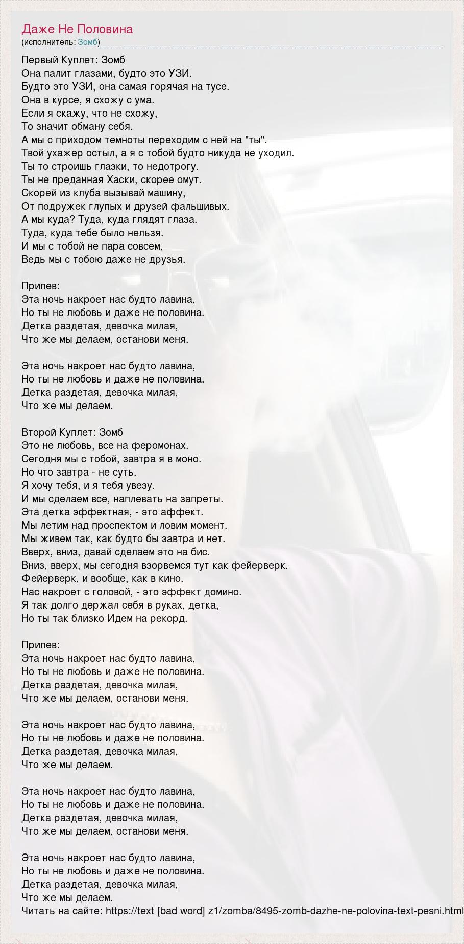 Первый Куплет: Зомб Она палит глазами, будто это УЗИ. Будто это УЗИ, она самая горячая на тусе. Она в курсе, я схожу с ума. Если я скажу, что не схожу, То значит обману себя. А мы с приходом темноты переходим с ней на "ты". Твой ухажер остыл, а я с тобой будто никуда не уходил. Ты то строишь глазки, то недотрогу. Ты не преданная Хаски, скорее омут. Скорей из клуба вызывай машину, От подружек глупых и друзей фальшивых. А мы куда? Туда, куда глядят глаза. Туда, куда тебе было нельзя. И мы с тобой не пара совсем, Ведь мы с тобою даже не друзья. Припев: Эта ночь накроет нас будто лавина, Но ты не любовь и даже не половина. Детка раздетая, девочка милая, Что же мы делаем, останови меня. Эта ночь накроет нас будто лавина, Но ты не любовь и даже не половина. Детка раздетая, девочка милая, Что же мы делаем. Второй Куплет: Зомб Это не любовь, все на феромонах. Сегодня мы с тобой, завтра я в моно. Но что завтра - не суть. Я хочу тебя, и я тебя увезу. И мы сделаем все, наплевать на запреты. Эта детка эффектная, - это аффект. Мы летим над проспектом и ловим момент. Мы живем так, как будто бы завтра и нет. Вверх, вниз, давай сделаем это на бис. Вниз, вверх, мы сегодня взорвемся тут как фейерверк. Фейерверк, и вообще, как в кино. Нас накроет с головой, - это эффект домино. Я так долго держал себя в руках, детка, Но ты так близко Идем на рекорд. Припев: Эта ночь накроет нас будто лавина, Но ты не любовь и даже не половина. Детка раздетая, девочка милая, Что же мы делаем, останови меня. Эта ночь накроет нас будто лавина, Но ты не любовь и даже не половина. Детка раздетая, девочка милая, Что же мы делаем. Эта ночь накроет нас будто лавина, Но ты не любовь и даже не половина. Детка раздетая, девочка милая, Что же мы делаем, останови меня. Эта ночь накроет нас будто лавина, Но ты не любовь и даже не половина. Детка раздетая, девочка милая, Что же мы делаем. Читать на сайте: https://text [bad word] z1/zomba/8495-zomb-dazhe-ne-polovina-text-pesni.html