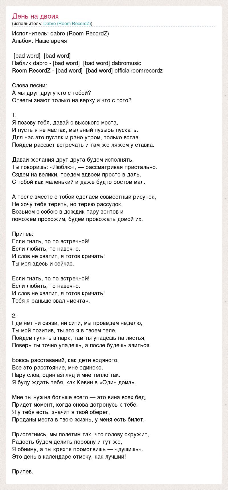 Исполнитель: dabro (Room RecordZ) Альбом: Наше время [bad word] [bad word] Паблик dabro - [bad word] [bad word] dabromusic Room RecordZ - [bad word] [bad word] officialroomrecordz Слова песни: А мы друг другу кто с тобой? Ответы знают только на верху и что с того? 1. Я позову тебя, давай с высокого моста, И пусть я не мастак, мыльный пузырь пускать. Для нас это пустяк и рано утром, только встав, Пойдем рассвет встречать и там же ляжем у ставка. Давай желания друг друга будем исполнять, Ты говоришь: «Люблю», — рассматривая пристально. Сядем на велики, поедем вдвоем просто в даль. С тобой как маленький и даже будто ростом мал. А после вместе с тобой сделаем совместный рисунок, Не хочу тебя терять, но теряю рассудок, Возьмем с собою в дождик пару зонтов и поможем прохожим, будем провожать домой их. Припев: Если гнать, то по встречной! Если любить, то навечно. И слов не хватит, я готов кричать! Ты моя здесь и сейчас. Если гнать, то по встречной! Если любить, то навечно. И слов не хватит, я готов кричать! Тебя я раньше звал «мечта». 2. Где нет ни связи, ни сити, мы проведем неделю, Ты мой позитив, ты это я в твоем теле. Пойдем гулять в парк, там ты упадешь на листья, Поверь ты точно упадешь, а после будешь злиться. Боюсь расставаний, как дети водяного, Все это расстояние, мне одиноко. Пару слов, один взгляд и мне тепло так. Я буду ждать тебя, как Кевин в «Один дома». Мне ты нужна больше всего — это вина всех бед, Придет момент, когда снова дотронусь к тебе. Я у тебя есть, значит я твой оберег, Проданы места в твою жизнь, у меня есть билет. Пристегнись, мы полетим так, что голову скружит, Радость будем делить поровну и тут же, Я обниму, а ты кряхтя промолвишь — «душишь». Это день в календаре отмечу, как лучший! Припев.