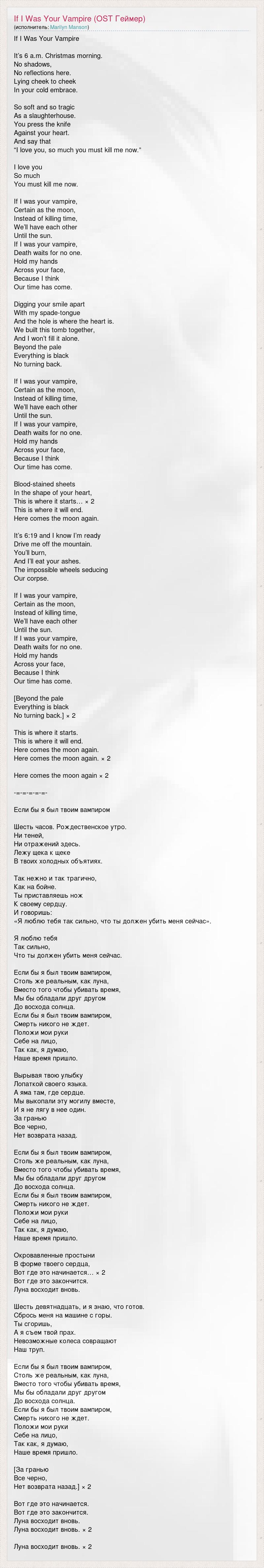 If I Was Your Vampire It’s 6 a.m. Christmas morning. No shadows, No reflections here. Lying cheek to cheek In your cold embrace. So soft and so tragic As a slaughterhouse. You press the knife Against your heart. And say that “I love you, so much you must kill me now.” I love you So much You must kill me now. If I was your vampire, Certain as the moon, Instead of killing time, We’ll have each other Until the sun. If I was your vampire, Death waits for no one. Hold my hands Across your face, Because I think Our time has come. Digging your smile apart With my spade-tongue And the hole is where the heart is. We built this tomb together, And I won’t fill it alone. Beyond the pale Everything is black No turning back. If I was your vampire, Certain as the moon, Instead of killing time, We’ll have each other Until the sun. If I was your vampire, Death waits for no one. Hold my hands Across your face, Because I think Our time has come. Blood-stained sheets In the shape of your heart, This is where it starts… × 2 This is where it will end. Here comes the moon again. It’s 6:19 and I know I’m ready Drive me off the mountain. You’ll burn, And I’ll eat your ashes. The impossible wheels seducing Our corpse. If I was your vampire, Certain as the moon, Instead of killing time, We’ll have each other Until the sun. If I was your vampire, Death waits for no one. Hold my hands Across your face, Because I think Our time has come. [Beyond the pale Everything is black No turning back.] × 2 This is where it starts. This is where it will end. Here comes the moon again. Here comes the moon again. × 2 Here comes the moon again × 2 -=-=-=-=-=- Если бы я был твоим вампиром Шесть часов. Рождественское утро. Ни теней, Ни отражений здесь. Лежу щека к щеке В твоих холодных объятиях. Так нежно и так трагично, Как на бойне. Ты приставляешь нож К своему сердцу. И говоришь: «Я люблю тебя так сильно, что ты должен убить меня сейчас». Я люблю тебя Так сильно, Что ты должен убить меня сейчас. Если бы я был твоим вампиром, Столь же реальным, как луна, Вместо того чтобы убивать время, Мы бы обладали друг другом До восхода солнца. Если бы я был твоим вампиром, Смерть никого не ждет. Положи мои руки Себе на лицо, Так как, я думаю, Наше время пришло. Вырывая твою улыбку Лопаткой своего языка. А яма там, где сердце. Мы выкопали эту могилу вместе, И я не лягу в нее один. За гранью Все черно, Нет возврата назад. Если бы я был твоим вампиром, Столь же реальным, как луна, Вместо того чтобы убивать время, Мы бы обладали друг другом До восхода солнца. Если бы я был твоим вампиром, Смерть никого не ждет. Положи мои руки Себе на лицо, Так как, я думаю, Наше время пришло. Окровавленные простыни В форме твоего сердца, Вот где это начинается… × 2 Вот где это закончится. Луна восходит вновь. Шесть девятнадцать, и я знаю, что готов. Сбрось меня на машине с горы. Ты сгоришь, А я съем твой прах. Невозможные колеса совращают Наш труп. Если бы я был твоим вампиром, Столь же реальным, как луна, Вместо того чтобы убивать время, Мы бы обладали друг другом До восхода солнца. Если бы я был твоим вампиром, Смерть никого не ждет. Положи мои руки Себе на лицо, Так как, я думаю, Наше время пришло. [За гранью Все черно, Нет возврата назад.] × 2 Вот где это начинается. Вот где это закончится. Луна восходит вновь. Луна восходит вновь. × 2 Луна восходит вновь. × 2