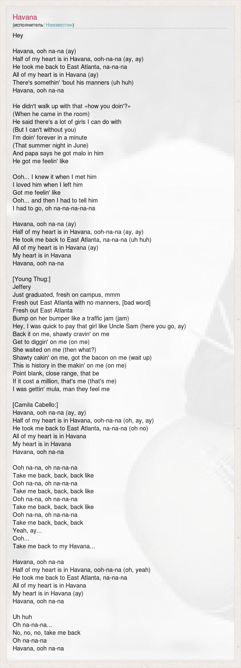 Hey Havana, ooh na-na (ay) Half of my heart is in Havana, ooh-na-na (ay, ay) He took me back to East Atlanta, na-na-na All of my heart is in Havana (ay) There's somethin' 'bout his manners (uh huh) Havana, ooh na-na He didn't walk up with that «how you doin'?» (When he came in the room) He said there's a lot of girls I can do with (But I can't without you) I'm doin' forever in a minute (That summer night in June) And papa says he got malo in him He got me feelin' like Ooh... I knew it when I met him I loved him when I left him Got me feelin' like Ooh... and then I had to tell him I had to go, oh na-na-na-na-na Havana, ooh na-na (ay) Half of my heart is in Havana, ooh-na-na (ay, ay) He took me back to East Atlanta, na-na-na (uh huh) All of my heart is in Havana (ay) My heart is in Havana Havana, ooh na-na [Young Thug:] Jeffery Just graduated, fresh on campus, mmm Fresh out East Atlanta with no manners, [bad word] Fresh out East Atlanta Bump on her bumper like a traffic jam (jam) Hey, I was quick to pay that girl like Uncle Sam (here you go, ay) Back it on me, shawty cravin' on me Get to diggin' on me (on me) She waited on me (then what?) Shawty cakin' on me, got the bacon on me (wait up) This is history in the makin' on me (on me) Point blank, close range, that be If it cost a million, that's me (that's me) I was gettin' mula, man they feel me [Camila Cabello:] Havana, ooh na-na (ay, ay) Half of my heart is in Havana, ooh-na-na (oh, ay, ay) He took me back to East Atlanta, na-na-na (oh no) All of my heart is in Havana My heart is in Havana Havana, ooh na-na Ooh na-na, oh na-na-na Take me back, back, back like Ooh na-na, oh na-na-na Take me back, back, back like Ooh na-na, oh na-na-na Take me back, back, back like Ooh na-na, oh na-na-na Take me back, back, back Yeah, ay... Ooh... Take me back to my Havana... Havana, ooh na-na Half of my heart is in Havana, ooh-na-na (oh, yeah) He took me back to East Atlanta, na-na-na All of my heart is in Havana My heart is in Havana (ay) Havana, ooh na-na Uh huh Oh na-na-na... No, no, no, take me back Oh na-na-na Havana, ooh na-na