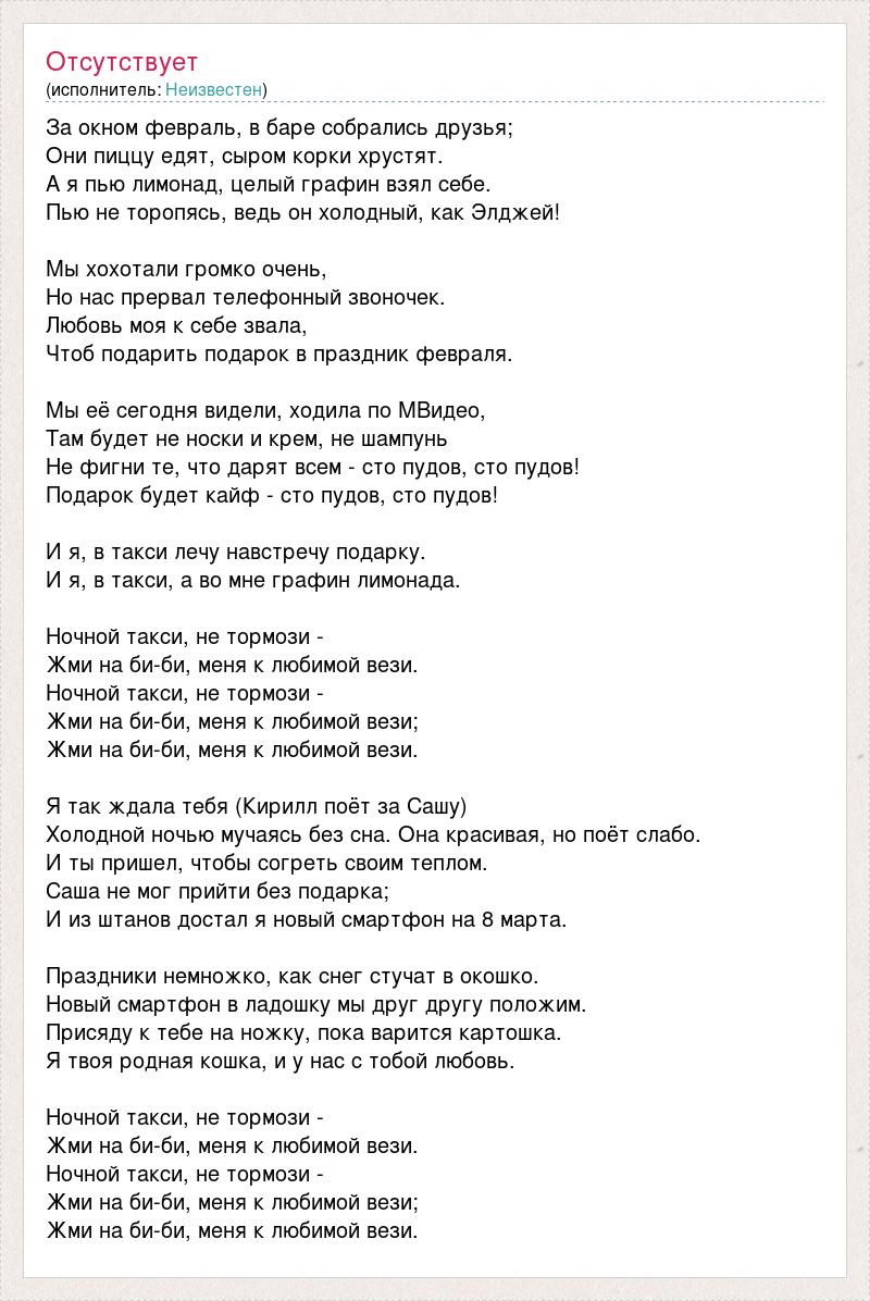 За окном февраль, в баре собрались друзья; Они пиццу едят, сыром корки хрустят. А я пью лимонад, целый графин взял себе. Пью не торопясь, ведь он холодный, как Элджей! Мы хохотали громко очень, Но нас прервал телефонный звоночек. Любовь моя к себе звала, Чтоб подарить подарок в праздник февраля. Мы её сегодня видели, ходила по МВидео, Там будет не носки и крем, не шампунь Не фигни те, что дарят всем - сто пудов, сто пудов! Подарок будет кайф - сто пудов, сто пудов! И я, в такси лечу навстречу подарку. И я, в такси, а во мне графин лимонада. Ночной такси, не тормози - Жми на би-би, меня к любимой вези. Ночной такси, не тормози - Жми на би-би, меня к любимой вези; Жми на би-би, меня к любимой вези. Я так ждала тебя (Кирилл поёт за Сашу) Холодной ночью мучаясь без сна. Она красивая, но поёт слабо. И ты пришел, чтобы согреть своим теплом. Саша не мог прийти без подарка; И из штанов достал я новый смартфон на 8 марта. Праздники немножко, как снег стучат в окошко. Новый смартфон в ладошку мы друг другу положим. Присяду к тебе на ножку, пока варится картошка. Я твоя родная кошка, и у нас с тобой любовь. Ночной такси, не тормози - Жми на би-би, меня к любимой вези. Ночной такси, не тормози - Жми на би-би, меня к любимой вези; Жми на би-би, меня к любимой вези.