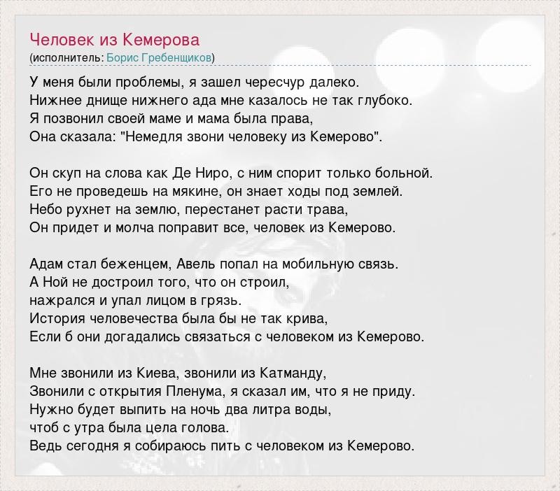 У меня были проблемы, я зашел чересчур далеко. Нижнее днище нижнего ада мне казалось не так глубоко. Я позвонил своей маме и мама была права, Она сказала: "Немедля звони человеку из Кемерово". Он скуп на слова как Де Ниро, с ним спорит только больной. Его не проведешь на мякине, он знает ходы под землей. Небо рухнет на землю, перестанет расти трава, Он придет и молча поправит все, человек из Кемерово. Адам стал беженцем, Авель попал на мобильную связь. А Ной не достроил того, что он строил, нажрался и упал лицом в грязь. История человечества была бы не так крива, Если б они догадались связаться с человеком из Кемерово. Мне звонили из Киева, звонили из Катманду, Звонили с открытия Пленума, я сказал им, что я не приду. Нужно будет выпить на ночь два литра воды, чтоб с утра была цела голова. Ведь сегодня я собираюсь пить с человеком из Кемерово.