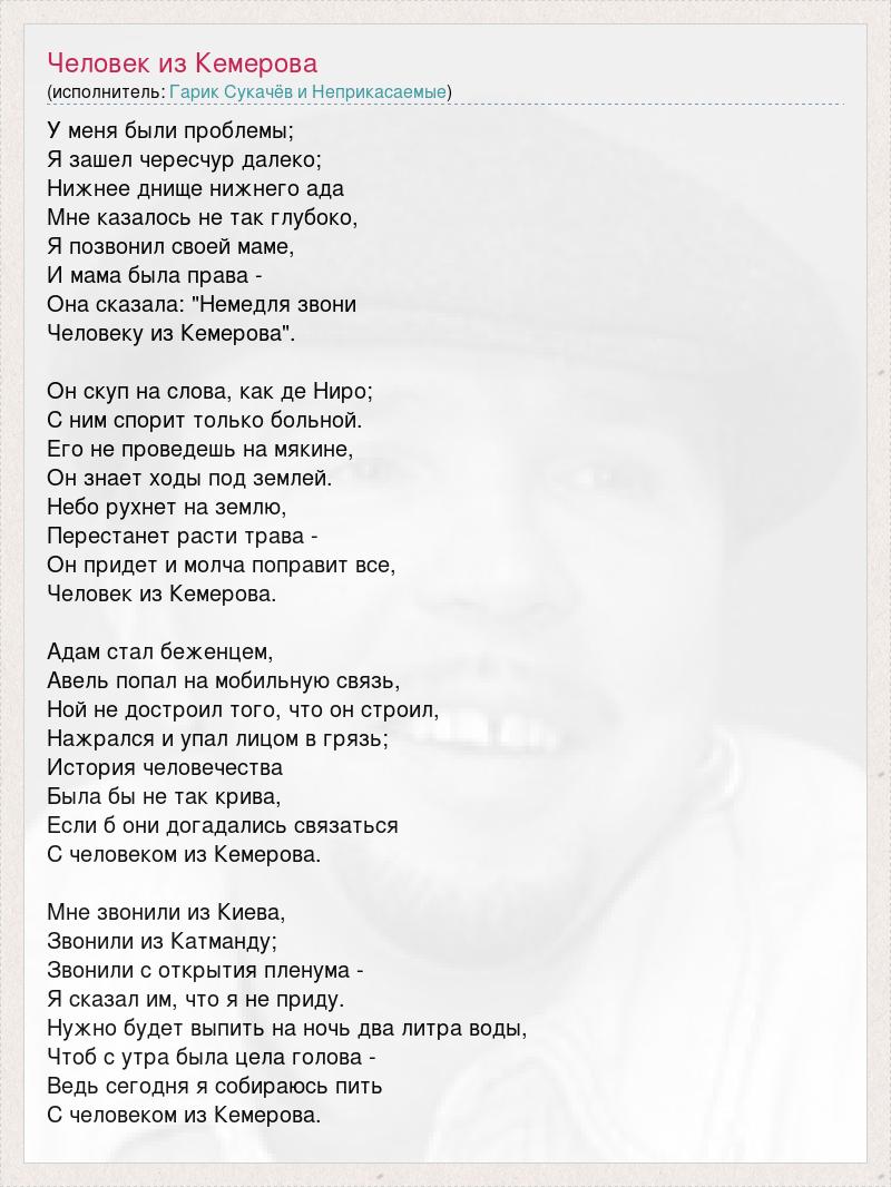 У меня были проблемы; Я зашел чересчур далеко; Нижнее днище нижнего ада Мне казалось не так глубоко, Я позвонил своей маме, И мама была права - Она сказала: "Немедля звони Человеку из Кемерова". Он скуп на слова, как де Ниро; С ним спорит только больной. Его не проведешь на мякине, Он знает ходы под землей. Небо рухнет на землю, Перестанет расти трава - Он придет и молча поправит все, Человек из Кемерова. Адам стал беженцем, Авель попал на мобильную связь, Ной не достроил того, что он строил, Нажрался и упал лицом в грязь; История человечества Была бы не так крива, Если б они догадались связаться С человеком из Кемерова. Мне звонили из Киева, Звонили из Катманду; Звонили с открытия пленума - Я сказал им, что я не приду. Нужно будет выпить на ночь два литра воды, Чтоб с утра была цела голова - Ведь сегодня я собираюсь пить С человеком из Кемерова.