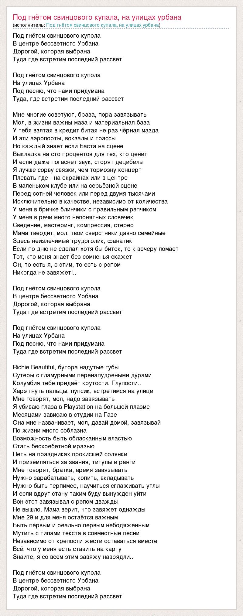 Под гнётом свинцового купола В центре бессветного Урбана Дорогой, которая выбрана Туда где встретим последний рассвет Под гнётом свинцового купола На улицах Урбана Под песню, что нами придумана Туда, где встретим последний рассвет Мне многие советуют, браза, пора завязывать Мол, в жизни важны маза и материальная база У тебя взятая в кредит битая не раз чёрная мазда И эти аэропорты, вокзалы и трассы Но каждый знает если Баста на сцене Выкладка на сто процентов для тех, кто ценит И если даже погаснет звук, сгорят децибелы Я лучше сорву связки, чем тормозну концерт Плевать где - на окрайнах или в центре В маленьком клубе или на серьёзной сцене Перед сотней человек или перед двумя тысячами Исключительно в качестве, независимо от количества У меня в бричке блинчики с правильным рэпчиком У меня в речи много непонятных словечек Сведение, мастеринг, компрессия, стерео Мама твердит, мол, твои сверстники давно семейные Здесь неизлечимый трудоголик, фанатик Если по дню не сделал хотя бы биток, то к вечеру ломает Тот, кто меня знает без сомненья скажет Он, то есть я, с этим, то есть с рэпом Никогда не завяжет!.. Под гнётом свинцового купола В центре бессветного Урбана Дорогой, которая выбрана Туда где встретим последний рассвет Под гнётом свинцового купола На улицах Урбана Под песню, что нами придумана Туда где встретим последний рассвет Richie Beautiful, бутора надутые губы Сутеры с гламурными перенапудреными дурами Колумбия тебе придаёт крутости. Глупости.. Харэ гнуть пальцы, пупсик, встретимся на улице Мне говорят, мол, надо завязывать Я убиваю глаза в Playstation на большой плазме Месяцами зависаю в студии на Газе Она мне названивает, мол, давай домой, завязывай По жизни много соблазна Возможность быть обласканным властью Стать бесхребетной мразью Петь на праздниках прокисшей солянки И приземляться за звания, титулы и ранги Мне говорят, братка, время завязывать Нужно зарабатывать, копить, вкладывать Нужно быть терпимее, научиться сглаживать углы И если вдруг стану таким буду вынужден уйти Вон этот завязывал с рэпом дважды Не вышло. Мама верит, что завяжет однажды Мне 29 и для меня остаётся важным Быть первым и реально первым небодяженным Мутить с типами текста в совместные песни Независимо от крепости жести оставаться вместе Всё, что у меня есть ставить на карту Знайте, я со всем этим завяжу наврядли.. Под гнётом свинцового купола В центре бессветного Урбана Дорогой, которая выбрана Туда где встретим последний рассвет