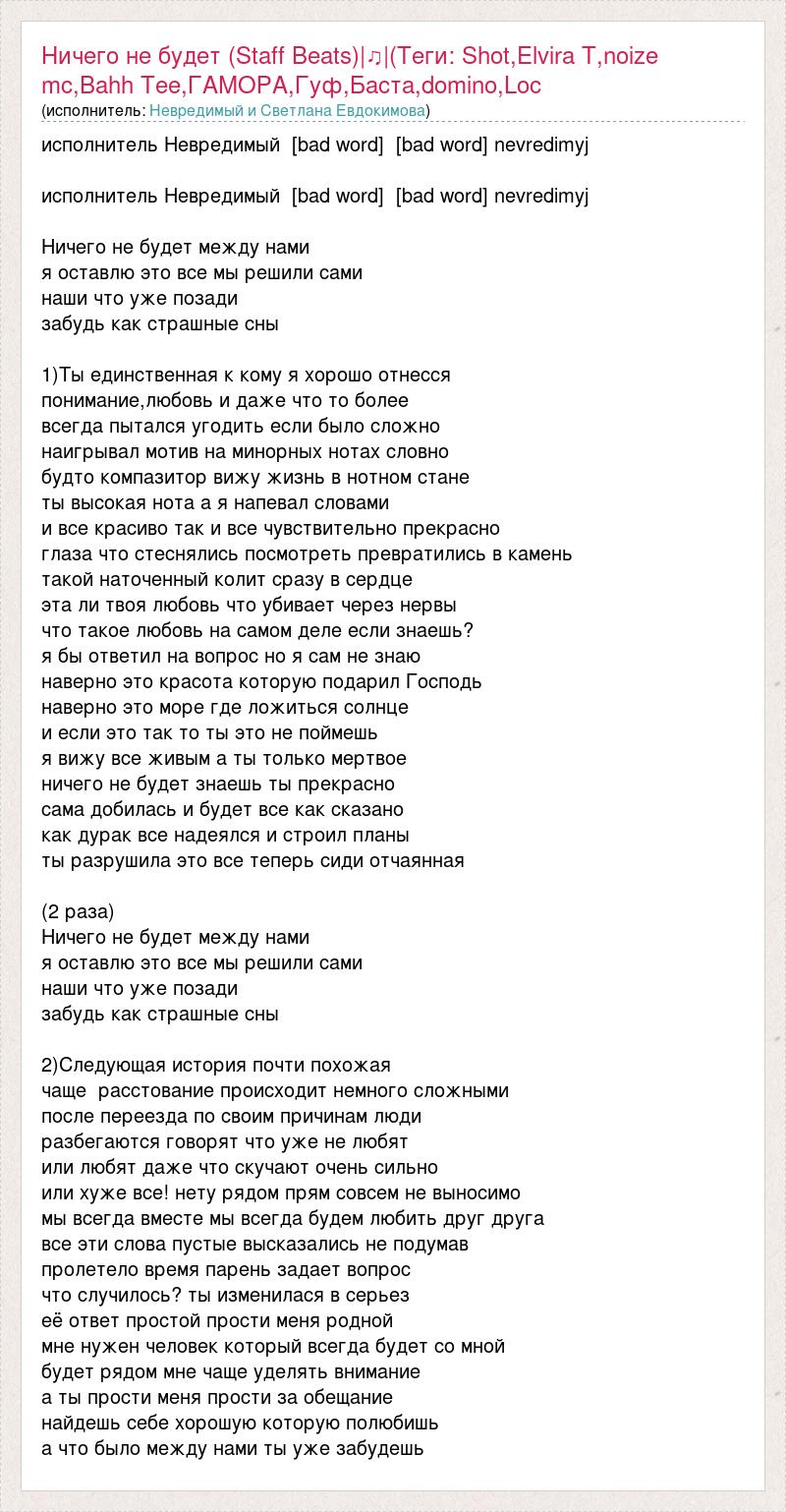 исполнитель Невредимый [bad word] [bad word] nevredimyj исполнитель Невредимый [bad word] [bad word] nevredimyj Ничего не будет между нами я оставлю это все мы решили сами наши что уже позади забудь как страшные сны 1)Ты единственная к кому я хорошо отнесся понимание,любовь и даже что то более всегда пытался угодить если было сложно наигрывал мотив на минорных нотах словно будто компазитор вижу жизнь в нотном стане ты высокая нота а я напевал словами и все красиво так и все чувствительно прекрасно глаза что стеснялись посмотреть превратились в камень такой наточенный колит сразу в сердце эта ли твоя любовь что убивает через нервы что такое любовь на самом деле если знаешь? я бы ответил на вопрос но я сам не знаю наверно это красота которую подарил Господь наверно это море где ложиться солнце и если это так то ты это не поймешь я вижу все живым а ты только мертвое ничего не будет знаешь ты прекрасно сама добилась и будет все как сказано как дурак все надеялся и строил планы ты разрушила это все теперь сиди отчаянная (2 раза) Ничего не будет между нами я оставлю это все мы решили сами наши что уже позади забудь как страшные сны 2)Следующая история почти похожая чаще расстование происходит немного сложными после переезда по своим причинам люди разбегаются говорят что уже не любят или любят даже что скучают очень сильно или хуже все! нету рядом прям совсем не выносимо мы всегда вместе мы всегда будем любить друг друга все эти слова пустые высказались не подумав пролетело время парень задает вопрос что случилось? ты изменилася в серьез её ответ простой прости меня родной мне нужен человек который всегда будет со мной будет рядом мне чаще уделять внимание а ты прости меня прости за обещание найдешь себе хорошую которую полюбишь а что было между нами ты уже забудешь
