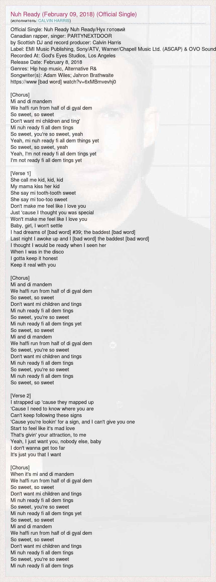 Official Single: Nuh Ready Nuh Ready/Нух готовий Canadian rapper, singer: PARTYNEXTDOOR by Scottish DJ and record producer: Calvin Harris Label: EMI Music Publishing, Sony/ATV, Warner/Chapell Music Ltd. (ASCAP) & OVO Sound Recorded At: God's Eyes Studios, Los Angeles Release Date: February 8, 2018 Genres: Hip hop music, Alternative R& Songwriter(s): Adam Wiles; Jahron Brathwaite https://www [bad word] watch?v=6xMBmvevhj0 [Chorus] Mi and di mandem We haffi run from half of di gyal dem So sweet, so sweet Don't want mi children and ting' Mi nuh ready fi all dem tings So sweet, you're so sweet, yeah Yeah, mi nuh ready fi all dem things yet So sweet, so sweet, yeah Yeah, I'm not ready fi all dem tings yet I'm not ready fi all dem tings yet [Verse 1] She call me kid, kid, kid My mama kiss her kid She say mi tooth-tooth sweet She say mi too-too sweet Don't make me feel like I love you Just 'cause I thought you was special Won't make me feel like I love you Baby, girl, I won't settle I had dreams of [bad word] #39; the baddest [bad word] Last night I awoke up and I [bad word] the baddest [bad word] I thought I would be ready when I seen her When I was in the disco I gotta keep it honest Keep it real with you [Chorus] Mi and di mandem We haffi run from half of di gyal dem So sweet, so sweet Don't want mi children and tings Mi nuh ready fi all dem tings So sweet, you're so sweet Mi nuh ready fi all dem tings yet So sweet, so sweet Mi and di mandem We haffi run from half of di gyal dem So sweet, you're so sweet Don't want mi children and tings Mi nuh ready fi all dem tings So sweet, you're so sweet Mi nuh ready fi all dem tings So sweet, so sweet [Verse 2] I strapped up 'cause they mapped up 'Cause I need to know where you are Can't keep following these signs 'Cause you're lookin' for a sign, and I can't give you one Start to feel like it's mad love That's givin' your attraction, to me Yeah, I just want you, nobody else, baby I don't wanna get too far It's just you that I want [Chorus] When it's mi and di mandem We haffi run from half of di gyal dem So sweet, so sweet Don't want mi children and tings Mi nuh ready fi all dem tings So sweet, you're so sweet Mi nuh ready fi all dem tings yet So sweet, so sweet Mi and di mandem We haffi run from half of di gyal dem So sweet, so sweet Don't want mi children and tings Mi nuh ready fi all dem tings So sweet, you're so sweet Mi nuh ready fi all dem tings