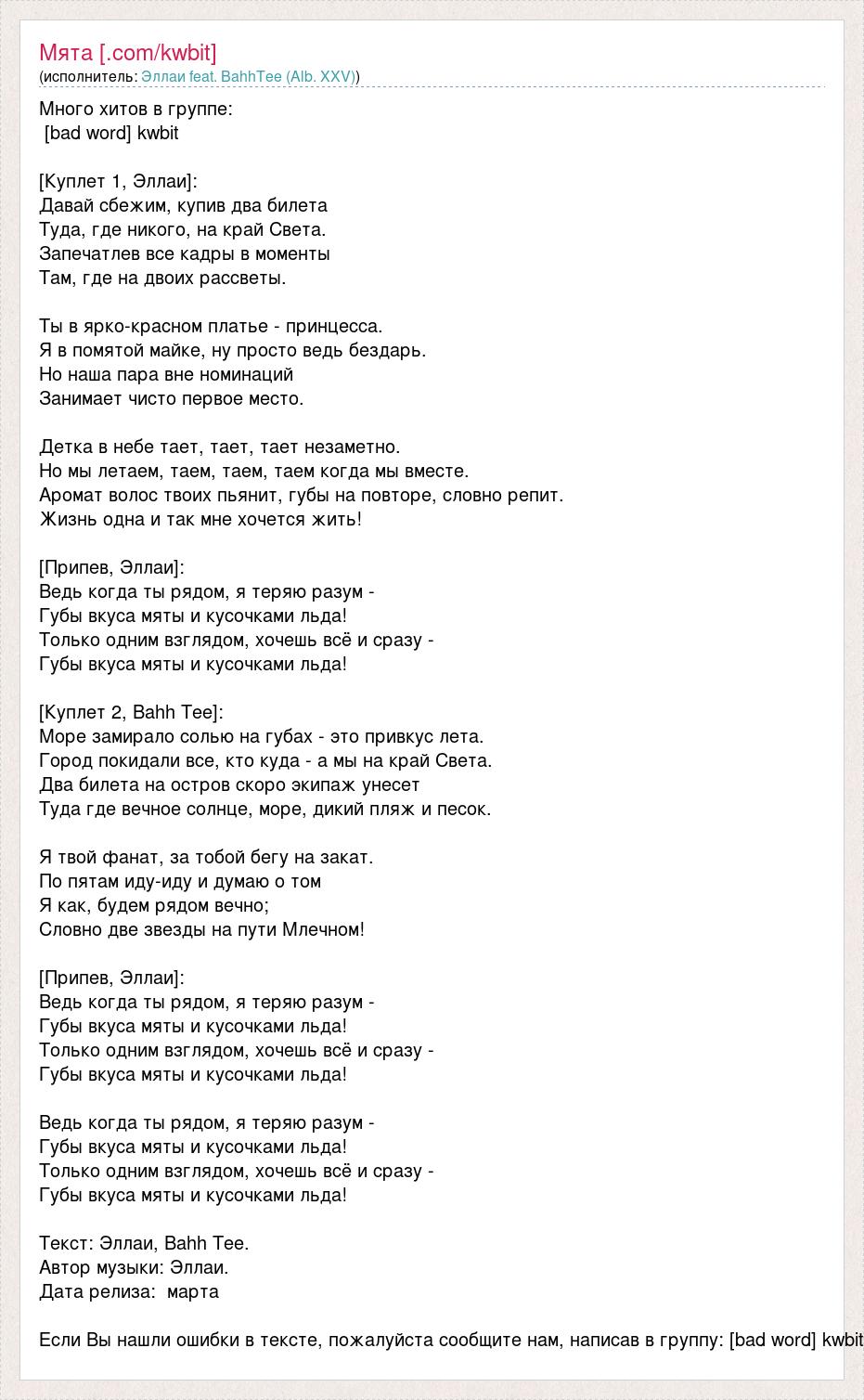 Много хитов в группе: [bad word] kwbit [Куплет 1, Эллаи]: Давай сбежим, купив два билета Туда, где никого, на край Света. Запечатлев все кадры в моменты Там, где на двоих рассветы. Ты в ярко-красном платье - принцесса. Я в помятой майке, ну просто ведь бездарь. Но наша пара вне номинаций Занимает чисто первое место. Детка в небе тает, тает, тает незаметно. Но мы летаем, таем, таем, таем когда мы вместе. Аромат волос твоих пьянит, губы на повторе, словно репит. Жизнь одна и так мне хочется жить! [Припев, Эллаи]: Ведь когда ты рядом, я теряю разум - Губы вкуса мяты и кусочками льда! Только одним взглядом, хочешь всё и сразу - Губы вкуса мяты и кусочками льда! [Куплет 2, Bahh Tee]: Море замирало солью на губах - это привкус лета. Город покидали все, кто куда - а мы на край Света. Два билета на остров скоро экипаж унесет Туда где вечное солнце, море, дикий пляж и песок. Я твой фанат, за тобой бегу на закат. По пятам иду-иду и думаю о том Я как, будем рядом вечно; Словно две звезды на пути Млечном! [Припев, Эллаи]: Ведь когда ты рядом, я теряю разум - Губы вкуса мяты и кусочками льда! Только одним взглядом, хочешь всё и сразу - Губы вкуса мяты и кусочками льда! Ведь когда ты рядом, я теряю разум - Губы вкуса мяты и кусочками льда! Только одним взглядом, хочешь всё и сразу - Губы вкуса мяты и кусочками льда! Текст: Эллаи, Bahh Tee. Автор музыки: Эллаи. Дата релиза: марта Если Вы нашли ошибки в тексте, пожалуйста сообщите нам, написав в группу: [bad word] kwbit