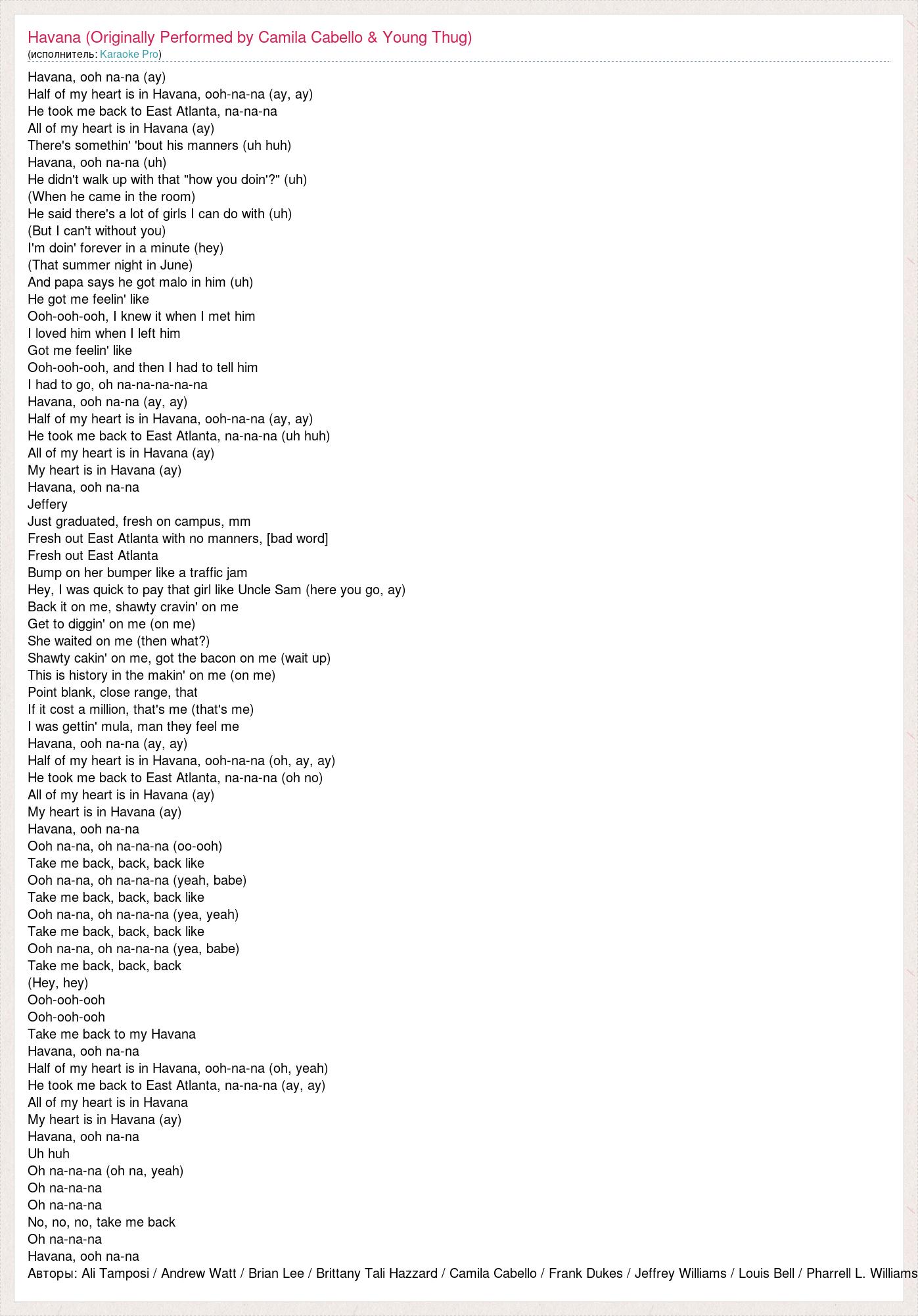 Havana, ooh na-na (ay) Half of my heart is in Havana, ooh-na-na (ay, ay) He took me back to East Atlanta, na-na-na All of my heart is in Havana (ay) There's somethin' 'bout his manners (uh huh) Havana, ooh na-na (uh) He didn't walk up with that "how you doin'?" (uh) (When he came in the room) He said there's a lot of girls I can do with (uh) (But I can't without you) I'm doin' forever in a minute (hey) (That summer night in June) And papa says he got malo in him (uh) He got me feelin' like Ooh-ooh-ooh, I knew it when I met him I loved him when I left him Got me feelin' like Ooh-ooh-ooh, and then I had to tell him I had to go, oh na-na-na-na-na Havana, ooh na-na (ay, ay) Half of my heart is in Havana, ooh-na-na (ay, ay) He took me back to East Atlanta, na-na-na (uh huh) All of my heart is in Havana (ay) My heart is in Havana (ay) Havana, ooh na-na Jeffery Just graduated, fresh on campus, mm Fresh out East Atlanta with no manners, [bad word] Fresh out East Atlanta Bump on her bumper like a traffic jam Hey, I was quick to pay that girl like Uncle Sam (here you go, ay) Back it on me, shawty cravin' on me Get to diggin' on me (on me) She waited on me (then what?) Shawty cakin' on me, got the bacon on me (wait up) This is history in the makin' on me (on me) Point blank, close range, that If it cost a million, that's me (that's me) I was gettin' mula, man they feel me Havana, ooh na-na (ay, ay) Half of my heart is in Havana, ooh-na-na (oh, ay, ay) He took me back to East Atlanta, na-na-na (oh no) All of my heart is in Havana (ay) My heart is in Havana (ay) Havana, ooh na-na Ooh na-na, oh na-na-na (oo-ooh) Take me back, back, back like Ooh na-na, oh na-na-na (yeah, babe) Take me back, back, back like Ooh na-na, oh na-na-na (yea, yeah) Take me back, back, back like Ooh na-na, oh na-na-na (yea, babe) Take me back, back, back (Hey, hey) Ooh-ooh-ooh Ooh-ooh-ooh Take me back to my Havana Havana, ooh na-na Half of my heart is in Havana, ooh-na-na (oh, yeah) He took me back to East Atlanta, na-na-na (ay, ay) All of my heart is in Havana My heart is in Havana (ay) Havana, ooh na-na Uh huh Oh na-na-na (oh na, yeah) Oh na-na-na Oh na-na-na No, no, no, take me back Oh na-na-na Havana, ooh na-na Авторы: Ali Tamposi / Andrew Watt / Brian Lee / Brittany Tali Hazzard / Camila Cabello / Frank Dukes / Jeffrey Williams / Louis Bell / Pharrell L. Williams