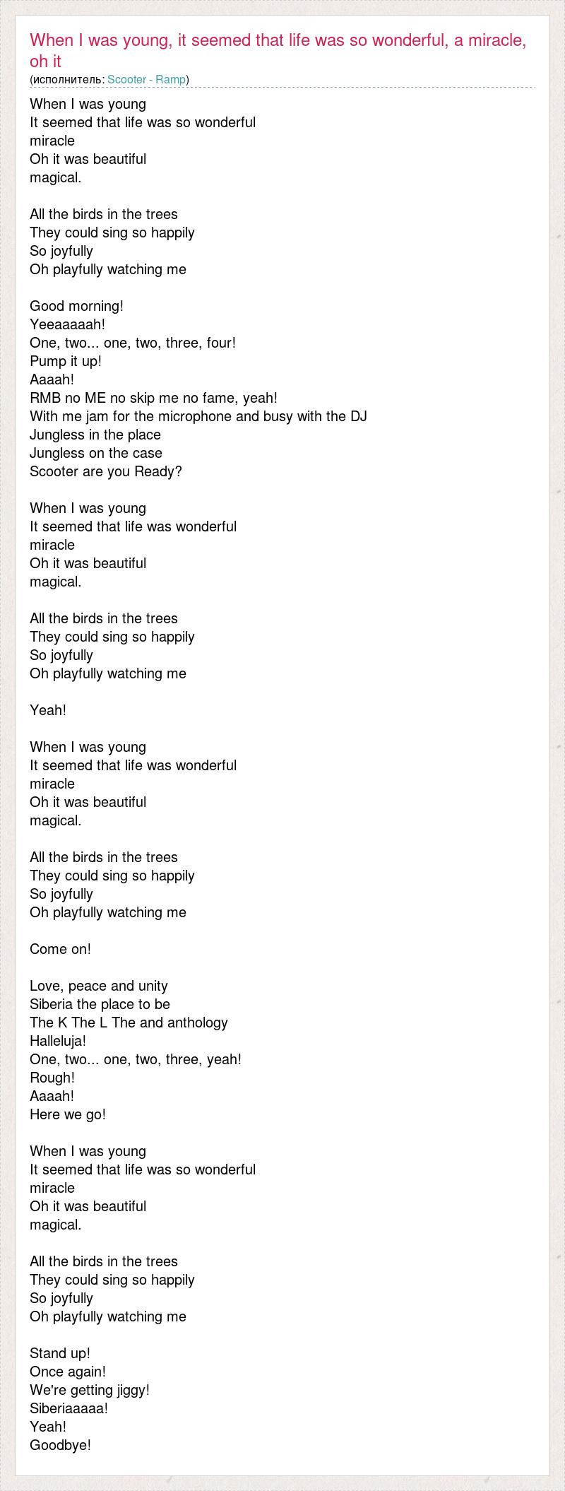 When I was young It seemed that life was so wonderful miracle Oh it was beautiful magical. All the birds in the trees They could sing so happily So joyfully Oh playfully watching me Good morning! Yeeaaaaah! One, two... one, two, three, four! Pump it up! Aaaah! RMB no ME no skip me no fame, yeah! With me jam for the microphone and busy with the DJ Jungless in the place Jungless on the case Scooter are you Ready? When I was young It seemed that life was wonderful miracle Oh it was beautiful magical. All the birds in the trees They could sing so happily So joyfully Oh playfully watching me Yeah! When I was young It seemed that life was wonderful miracle Oh it was beautiful magical. All the birds in the trees They could sing so happily So joyfully Oh playfully watching me Come on! Love, peace and unity Siberia the place to be The K The L The and anthology Halleluja! One, two... one, two, three, yeah! Rough! Aaaah! Here we go! When I was young It seemed that life was so wonderful miracle Oh it was beautiful magical. All the birds in the trees They could sing so happily So joyfully Oh playfully watching me Stand up! Once again! We're getting jiggy! Siberiaaaaa! Yeah! Goodbye!