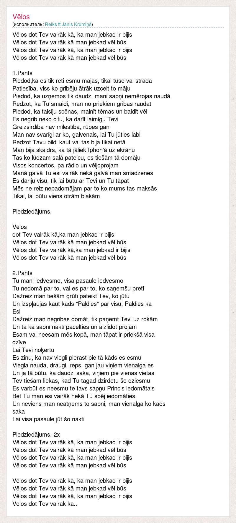 Vēlos dot Tev vairāk kā, ka man jebkad ir bijis Vēlos dot Tev vairāk kā man jebkad vēl būs Vēlos dot Tev vairāk kā, ka man jebkad ir bijis Vēlos dot Tev vairāk kā man jebkad vēl būs 1.Pants Piedod,ka es tik reti esmu mājās, tikai tusē vai strādā Patiesība, viss ko gribēju ātrāk uzcelt to māju Piedod, ka uzņemos tik daudz, mani sapņi nemērojas naudā Redzot, ka Tu smaidi, man no priekiem gribas raudāt Piedod, ka taisīju scēnas, mainīt tēmas un baidīt vēl Es negrib neko citu, ka darīt laimīgu Tevi Greizsirdība nav mīlestība, rūpes gan Man nav svarīgi ar ko, galvenais, lai Tu jūties labi Redzot Tavu bildi kaut vai tas bija tikai netā Man bija skaidrs, ka tā jāliek Iphon'ā uz ekrānu Tas ko lūdzam salā pateicu, es tiešām tā domāju Visos koncertos, pa rādio un vēljoprojam Manā galvā Tu esi vairāk nekā galvā man smadzenes Es darīju visu, tik lai būtu ar Tevi un Tu tāpat Mēs ne reiz nepadomājam par to ko mums tas maksās Tikai, lai būtu viens otrām blakām Piedziedājums. Vēlos dot Tev vairāk kā,ka man jebkad ir bijis Vēlos dot Tev vairāk kā man jebkad vēl būs Vēlos dot Tev vairāk kā,ka man jebkad ir bijis Vēlos dot Tev vairāk kā man jebkad vēl būs 2.Pants Tu mani iedvesmo, visa pasaule iedvesmo Tu nedomā par to, vai es par to, ko saņemšu pretī Dažreiz man tiešām grūti pateikt Tev, ko jūtu Un izspļaujas kaut kāds "Paldies" par visu, Paldies ka Esi Dažreiz man negribas domāt, tik paņemt Tevi uz rokām Un ta ka sapnī naktī pacelties un aizlidot projām Esam vai neesam mēs kopā, man tāpat ir priekšā visa dzīve Lai Tevi noķertu Es zinu, ka nav viegli pierast pie tā kāds es esmu Viegla nauda, draugi, reps, gan jau viņiem vienalga es Un ja tā būtu, ka daudzi saka, viņiem pie vienas vietas Tev tiešām liekas, kad Tu tagad dzirdētu šo dziesmu Es varbūt es neesmu te tavs sapņu Princis iedomātais Bet Tu man esi vairāk nekā Tu spēj iedomāties Un neviens man neatņems to sapni, man vienalga ko kāds saka Lai visa pasaule jūt šo nakti Piedziedājums. 2x Vēlos dot Tev vairāk kā, ka man jebkad ir bijis Vēlos dot Tev vairāk kā man jebkad vēl būs Vēlos dot Tev vairāk kā, ka man jebkad ir bijis Vēlos dot Tev vairāk kā man jebkad vēl būs Vēlos dot Tev vairāk kā, ka man jebkad ir bijis Vēlos dot Tev vairāk kā man jebkad vēl būs Vēlos dot Tev vairāk kā, ka man jebkad ir bijis Vēlos dot Tev vairāk kā..